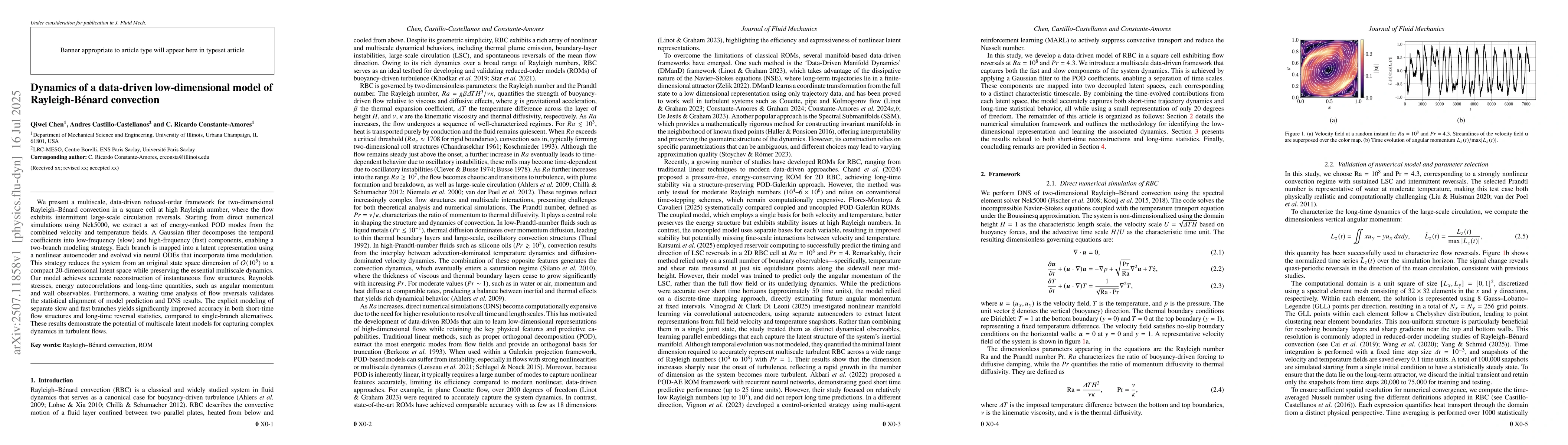 We present a multiscale, data-driven reduced-order framework for two-dimensional Rayleigh Benard convection in a square cell at high Rayleigh number, where the flow exhibits intermittent large-scale circulation reversals. Starting from direct numerical simulations using Nek5000, we extract a set of energy-ranked POD modes from the combined velocity and temperature fields. A Gaussian filter decomposes the temporal coefficients into low-frequency (slow) and high-frequency (fast) components, enabling a two-branch modeling strategy. Each branch is mapped into a latent representation using a nonlinear autoencoder and evolved via neural ODEs that incorporate time modulation. This strategy reduces the system from an original state space dimension of 10^5 to a compact 20-dimensional latent space while preserving the essential multiscale dynamics. Our model achieves accurate reconstruction of instantaneous flow structures, Reynolds stresses, energy autocorrelations and long-time quantities, such as angular momentum and wall observables. Furthermore, a waiting time analysis of flow reversals validates the statistical alignment of model prediction and DNS results. The explicit modeling of separate slow and fast branches yields significantly improved accuracy in both short-time flow structures and long-time reversal statistics, compared to single-branch alternatives. These results demonstrate the potential of multiscale latent models for capturing complex dynamics in turbulent flows.