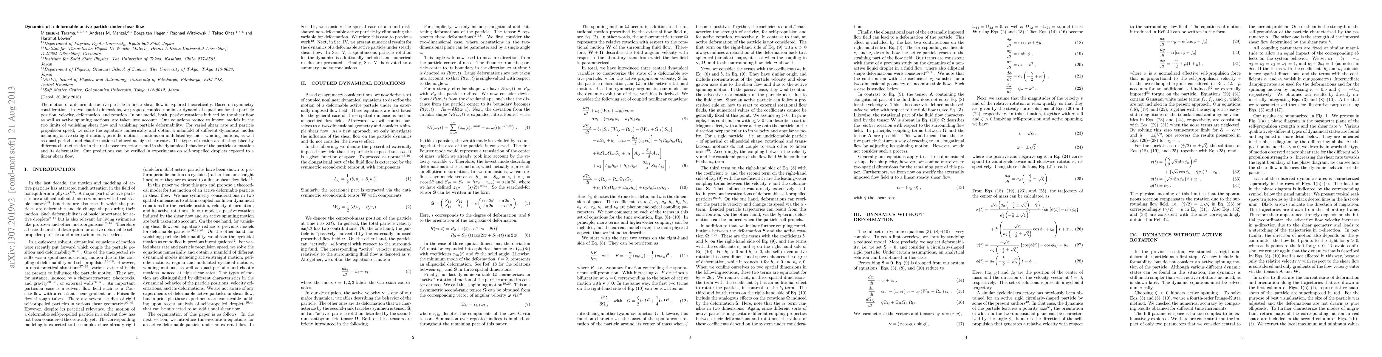 This paper proposes coupled nonlinear dynamical equations to model the motion of deformable active particles under shear flow, considering both passive and active rotations. Numerical solutions reveal diverse dynamical modes including straight, periodic, and chaotic motions, which can be experimentally verified using self-propelled droplets in shear flow.