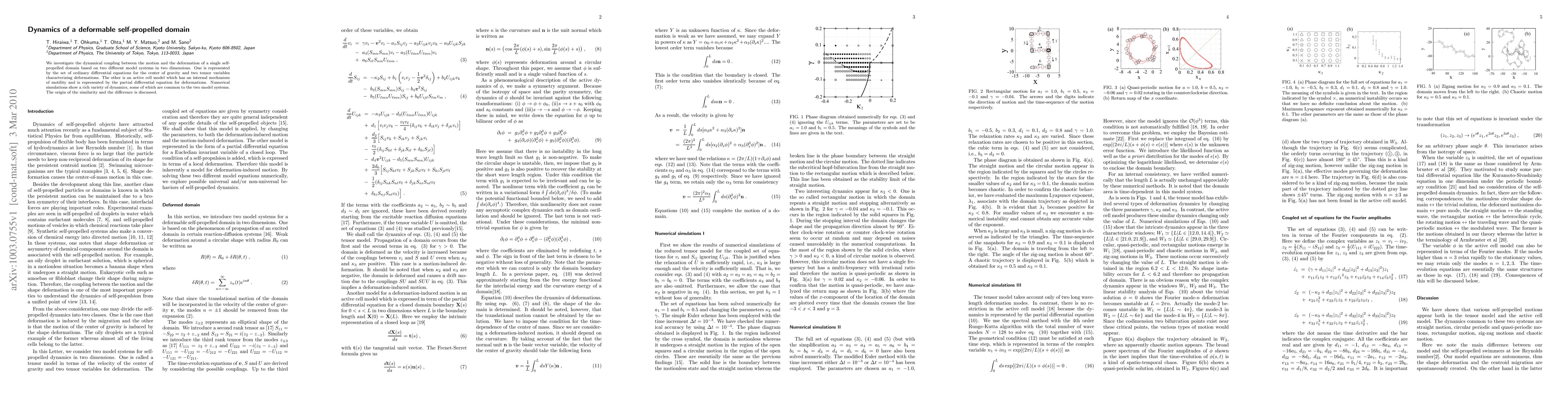 We investigate the dynamical coupling between the motion and the deformation of a single self-propelled domain based on two different model systems in two dimensions. One is represented by the set of ordinary differential equations for the center of gravity and two tensor variables characterizing deformations. The other is an active cell model which has an internal mechanism of motility and is represented by the partial differential equation for deformations. Numerical simulations show a rich variety of dynamics, some of which are common to the two model systems. The origin of the similarity and the difference is discussed.
