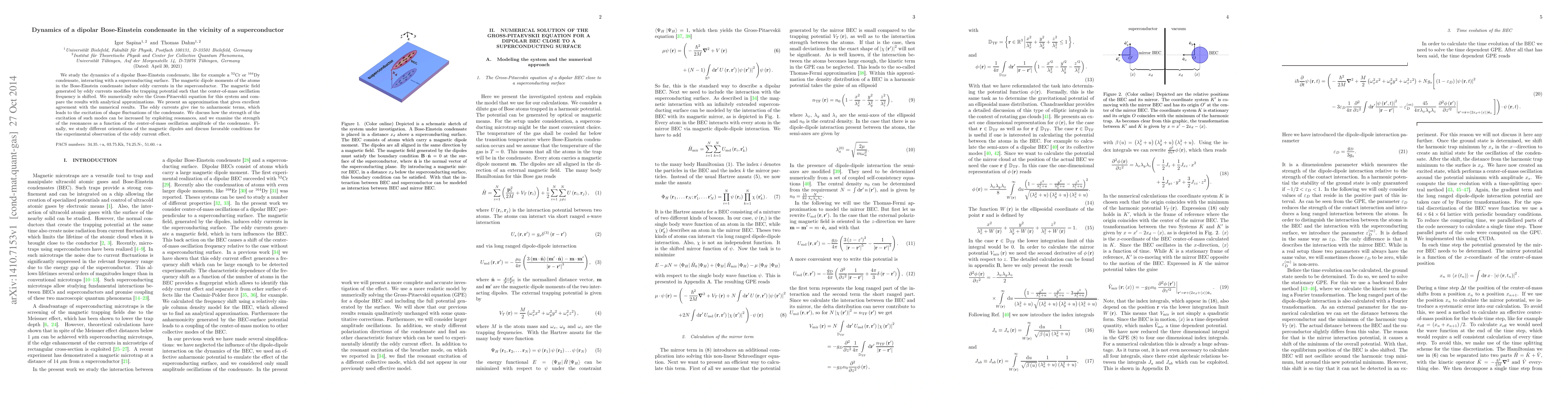 We study the dynamics of a dipolar Bose-Einstein condensate, like for example a $^{52}$Cr or $^{164}$Dy condensate, interacting with a superconducting surface. The magnetic dipole moments of the atoms in the Bose-Einstein condensate induce eddy currents in the superconductor. The magnetic field generated by eddy currents modifies the trapping potential such that the center-of-mass oscillation frequency is shifted. We numerically solve the Gross-Pitaevskii equation for this system and compare the results with analytical approximations. We present an approximation that gives excellent agreement with the numerical results. The eddy currents give rise to anharmonic terms, which leads to the excitation of shape fluctuations of the condensate. We discuss how the strength of the excitation of such modes can be increased by exploiting resonances, and we examine the strength of the resonances as a function of the center-of-mass oscillation amplitude of the condensate. Finally, we study different orientations of the magnetic dipoles and discuss favorable conditions for the experimental observation of the eddy current effect.