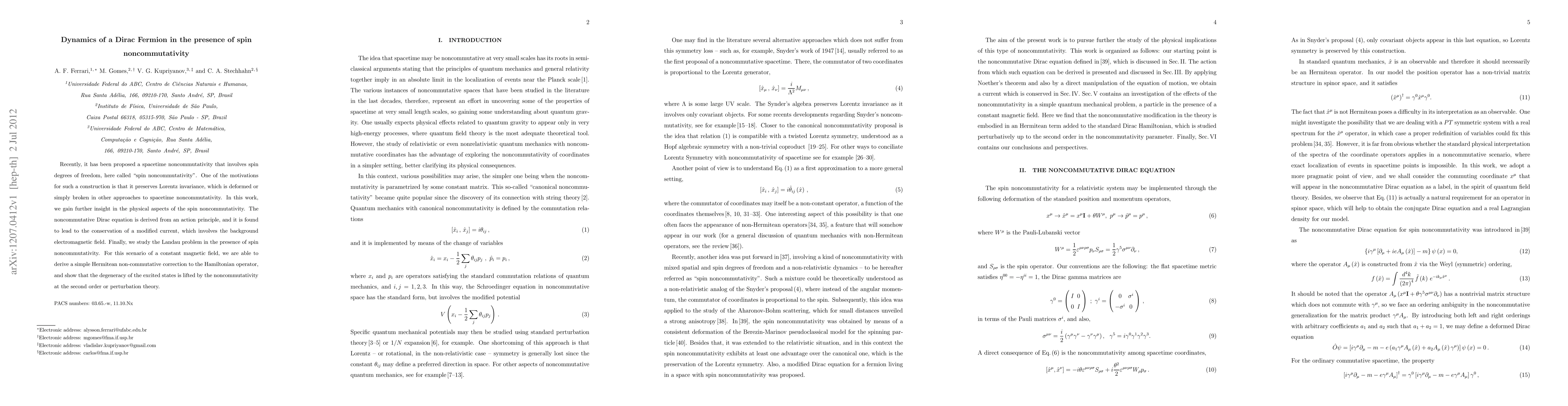 This paper explores the dynamics of a Dirac fermion under spin noncommutativity, deriving a modified noncommutative Dirac equation that preserves Lorentz invariance. It demonstrates how spin noncommutativity lifts the degeneracy of excited states in a magnetic field, providing a Hermitian correction to the Hamiltonian at the second order of perturbation theory.