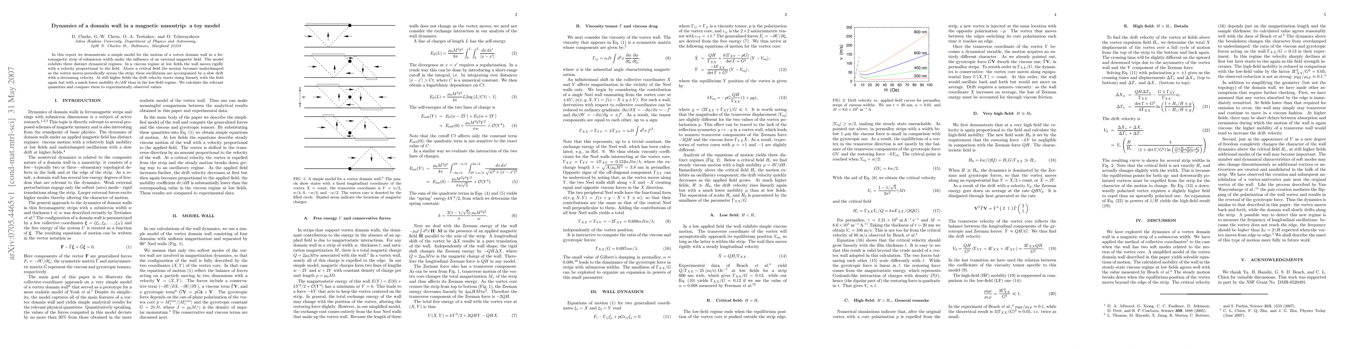 In this report we demonstrate a simple model for the motion of a vortex domain wall in a ferromagnetic strip of submicron width under the influence of an external magnetic field. The model exhibits three distinct dynamical regimes. In a viscous regime at low fields the wall moves rigidly with a velocity proportional to the field. Above a critical field the motion becomes underdamped as the vortex moves periodically across the strip; these oscillations are accompanied by a slow drift with a decreasing velocity. At still higher fields the drift velocity starts rising linearly with the field again but with a much lower mobility dv/dH than in the low-field regime. We calculate the relevant quantities and compare them to experimentally observed values.
