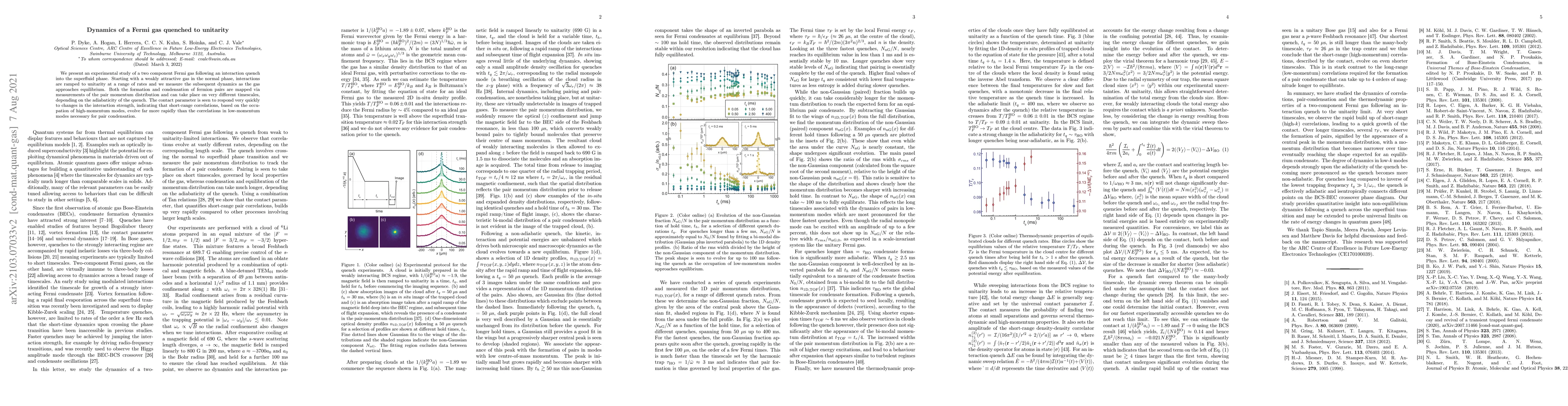 This study investigates the dynamics of a two-component Fermi gas undergoing an interaction quench into the superfluid phase, revealing that pair formation and condensation occur on different timescales. The contact parameter quickly adjusts to interaction changes, indicating rapid evolution of high-momentum correlations compared to low-momentum pair condensation.