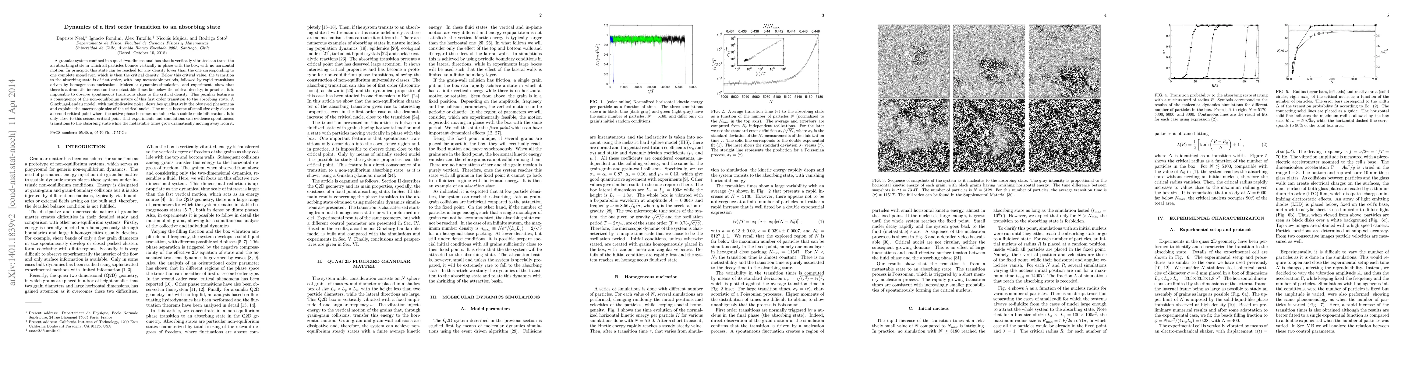 A granular system confined in a quasi two-dimensional box that is vertically vibrated can transit to an absorbing state in which all particles bounce vertically in phase with the box, with no horizontal motion. In principle, this state can be reached for any density lower than the one corresponding to one complete monolayer, which is then the critical density. Below this critical value, the transition to the absorbing state is of first order, with long metastable periods, followed by rapid transitions driven by homogeneous nucleation. Molecular dynamics simulations and experiments show that there is a dramatic increase on the metastable times far below the critical density; in practice, it is impossible to observe spontaneous transitions close to the critical density. This peculiar feature is a consequence of the non-equilibrium nature of this first order transition to the absorbing state. A Ginzburg-Landau model, with multiplicative noise, describes qualitatively the observed phenomena and explains the macroscopic size of the critical nuclei. The nuclei become of small size only close to a second critical point where the active phase becomes unstable via a saddle node bifurcation. It is only close to this second critical point that experiments and simulations can evidence spontaneous transitions to the absorbing state while the metastable times grow dramatically moving away from it.