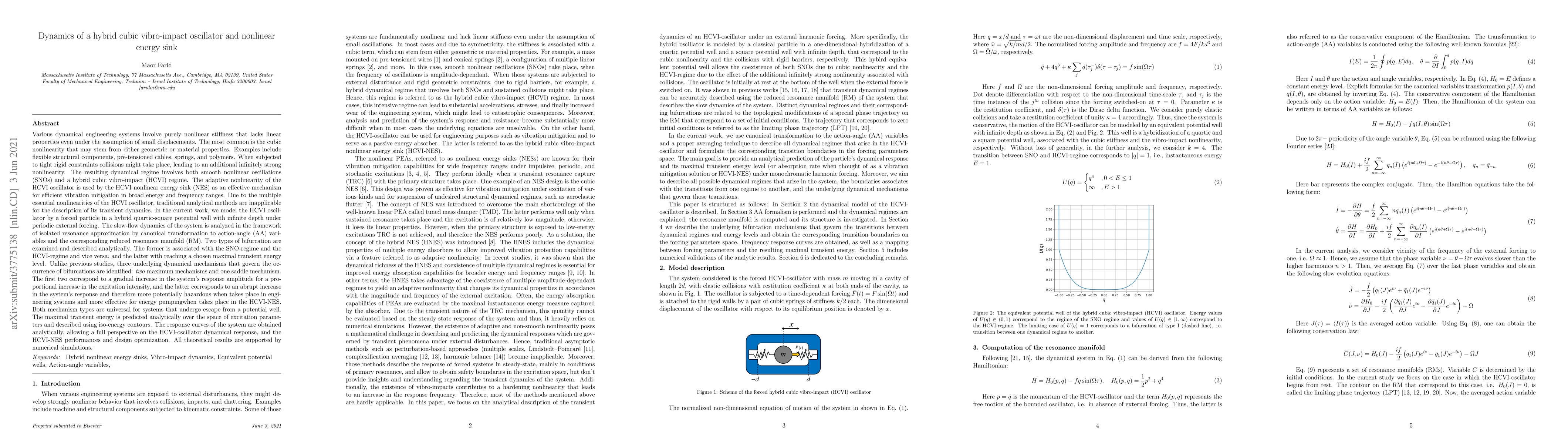 Various dynamical engineering systems involve purely nonlinear stiffness that lacks linear properties even under the assumption of small displacements. The most common is the cubic nonlinearity that may stem from either geometric or material properties. Examples include flexible structural components, pre-tensioned cables, springs, and polymers. When subjected to tight rigid constraints collisions might take place, leading to an additional infinitely strong nonlinearity. The resulting dynamical regime involves both smooth nonlinear oscillations (SNOs) and a hybrid cubic vibro-impact (HCVI) regime. The adaptive nonlinearity of the HCVI oscillator is used by the HCVI-nonlinear energy sink (NES) as an effective mechanism for efficient vibration mitigation in broad energy and frequency ranges. Due to the multiple essential nonlinearities of the HCVI oscillator, traditional analytical methods are inapplicable for the description of its transient dynamics. In the current work, we model the HCVI oscillator by a forced particle in a hybrid quartic-square potential well with infinite depth under periodic external forcing. Unlike previous studies, three underlying dynamical mechanisms that govern the occurrence of bifurcations are identified: two maximum mechanisms and one saddle mechanism. The maximal transient energy is predicted analytically over the space of excitation parameters and described using iso-energy contours. The response curves of the system are obtained analytically, allowing a full perspective on the HCVI-oscillator dynamical response, and the HCVI-NES performances and design optimization. All theoretical results are supported by numerical simulations.