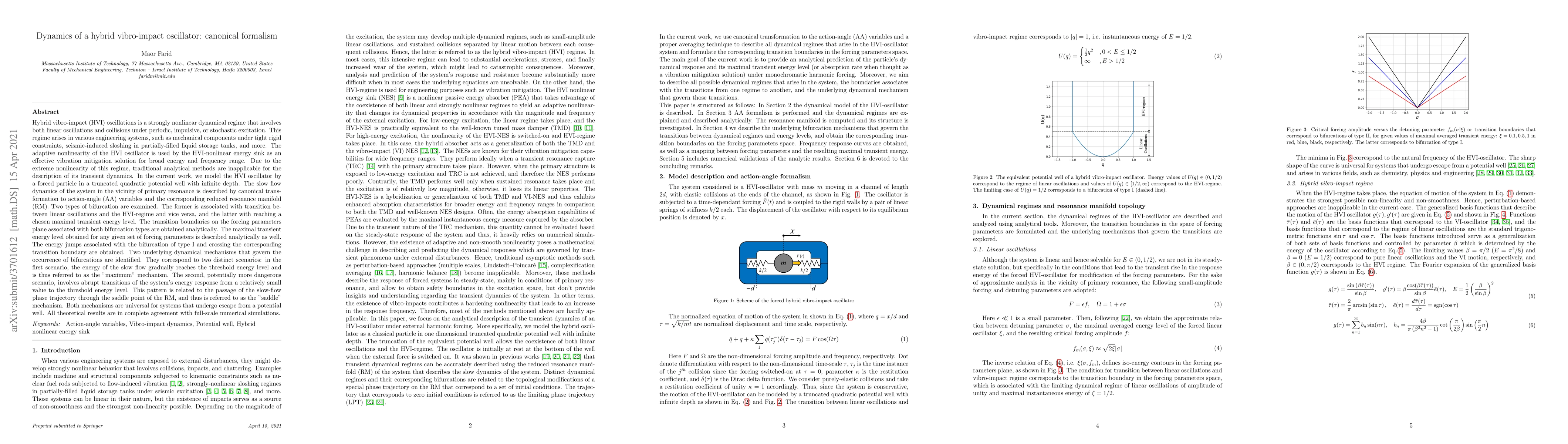 This paper explores the dynamics of hybrid vibro-impact oscillators using canonical formalism, focusing on the transition between linear oscillations and the HVI regime. Analytical methods reveal the bifurcation mechanisms, including the "maximum" and "saddle" mechanisms, governing the system's energy response and escape from a potential well, validated by numerical simulations.