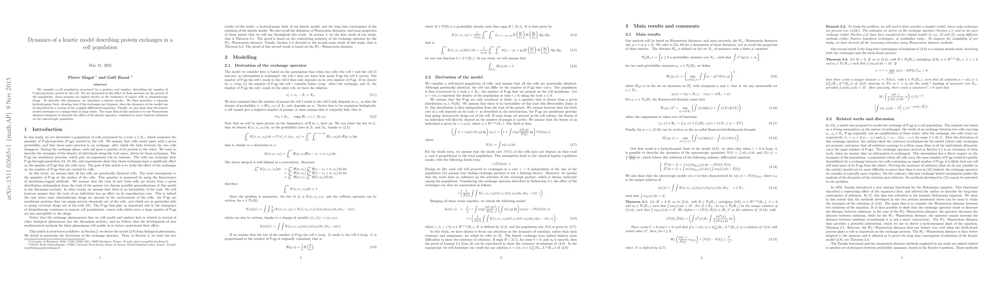 The paper introduces a kinetic model for protein exchanges in cell populations, establishes a hydrodynamic limit, and proves convergence to a unique limit using Wasserstein distance estimates, contributing novel mathematical techniques to the study of biological systems.