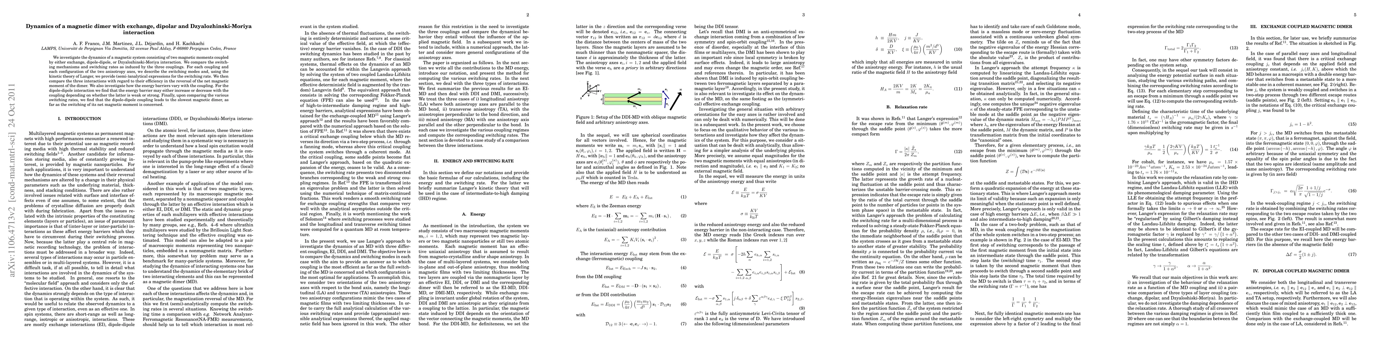 The paper investigates the dynamics of a magnetic dimer with different interactions (exchange, dipolar, Dzyalozhinski-Moriya) and finds that dipole-dipole coupling leads to the slowest switching rate.