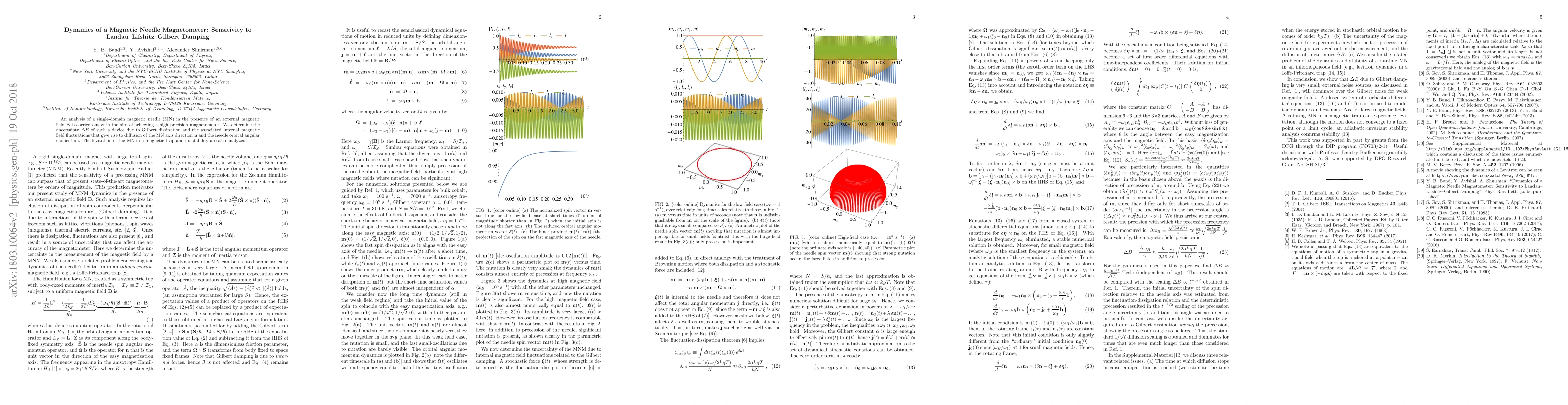 This paper analyzes a single-domain magnetic needle's behavior under external magnetic fields, determining its sensitivity to Gilbert damping. It explores the magnetic needle's precision as a magnetometer, its stability in levitation, and the impact of internal magnetic field fluctuations on its performance.