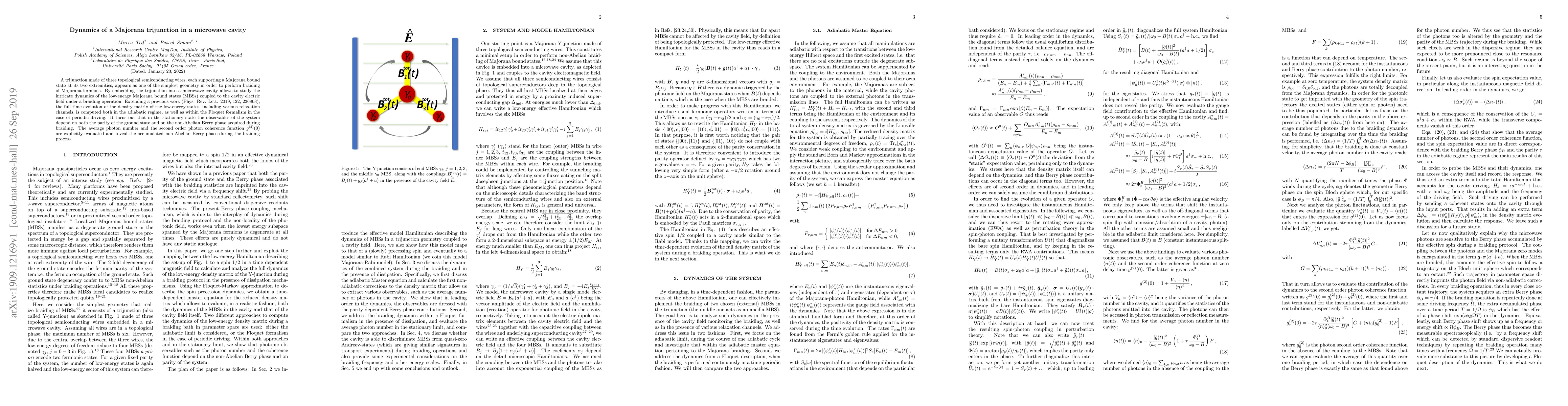 A trijunction made of three topological semiconducting wires, each supporting a Majorana bound state at its two extremities, appears as one of the simplest geometry in order to perform braiding of Majorana fermions. By embedding the trijunction into a microwave cavity allows to study the intricate dynamics of the low-energy Majorana bound states (MBSs) coupled to the cavity electric field under a braiding operation. Extending a previous work (Phys. Rev. Lett. 2019, 122, 236803), the full time evolution of the density matrix of the low-energy states, including various relaxation channels, is computed both in the adiabatic regime, as well as within the Floquet formalism in the case of periodic driving. It turns out that in the stationary state the observables of the system depend on both the parity of the ground state and on the non-Abelian Berry phase acquired during braiding. The average photon number and the second order photon coherence function $g^{(2)}(0)$ are explicitly evaluated and reveal the accumulated non-Abelian Berry phase during the braiding process.