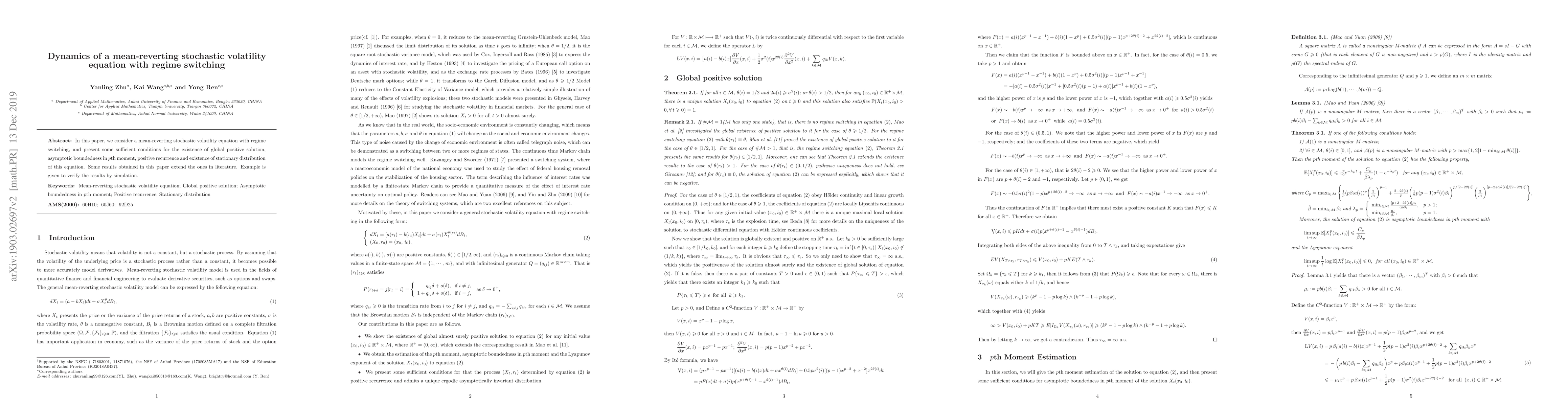 In this paper, we consider a mean-reverting stochastic volatility equation with regime switching, and present some sufficient conditions for the existence of global positive solution, asymptotic boundedness in pth moment, positive recurrence and existence of stationary distribution of this equation. Some results obtained in this paper extend the ones in literature. Example is given to verify the results by simulation.
