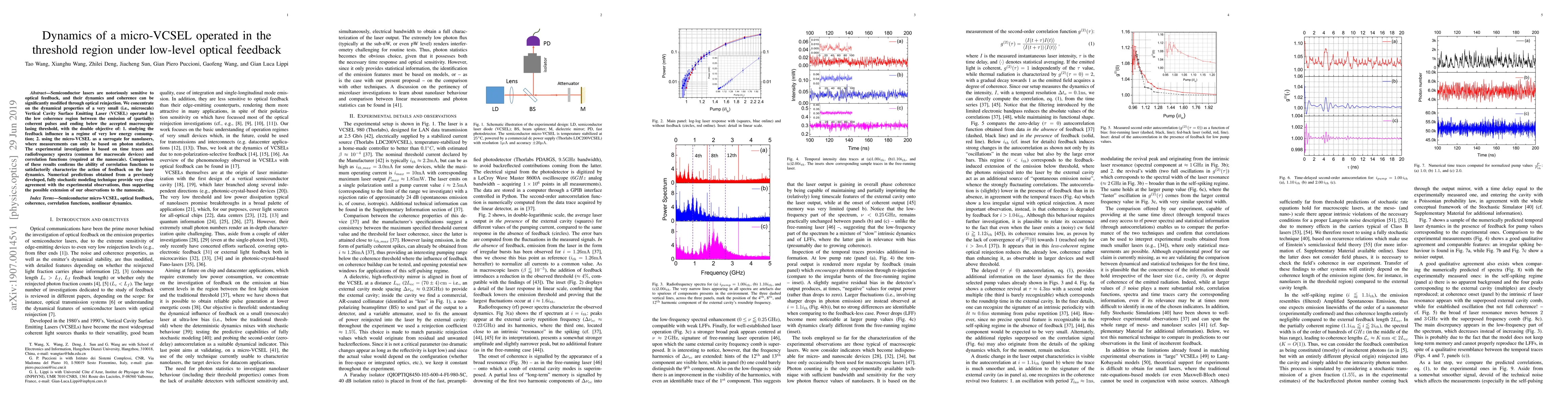 Semiconductor lasers are notoriously sensitive to optical feedback, and their dynamics and coherence can be significantly modified through optical reinjection. We concentrate on the dynamical properties of a very small (i.e., microscale) Vertical Cavity Surface Emitting Laser (VCSEL) operated in the low coherence region between the emission of (partially) coherent pulses and ending below the accepted macroscopic lasing threshold, with the double objective of: 1. studying the feedback influence in a regime of very low energy consumption; 2. using the micro-VCSEL as a surrogate for nanolasers, where measurements can only be based on photon statistics. The experimental investigation is based on time traces and radiofrequency spectra (common for macroscale devices) and correlation functions (required at the nanoscale). Comparison of these results confirms the ability of correlation functions to satisfactorily characterize the action of feedback on the laser dynamics. Numerical predictions obtained from a previously developed, fully stochastic modeling technique provide very close agreement with the experimental observations, thus supporting the possible extension of our observations to the nanoscale.