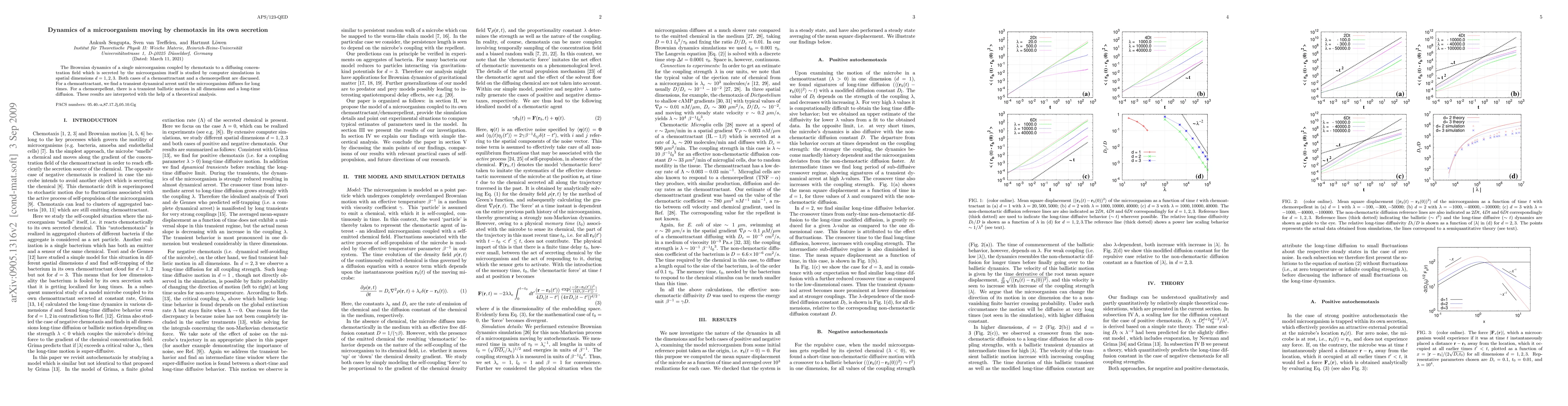 The Brownian dynamics of a single microorganism coupled by chemotaxis to a diffusing concentration field which is secreted by the microorganism itself is studied by computer simulations in spatial dimensions $d=1,2,3$. Both cases of a chemoattractant and a chemorepellent are discussed. For a chemoattractant, we find a transient dynamical arrest until the microorganism diffuses for long times. For a chemorepellent, there is a transient ballistic motion in all dimensions and a long-time diffusion. These results are interpreted with the help of a theoretical analysis.