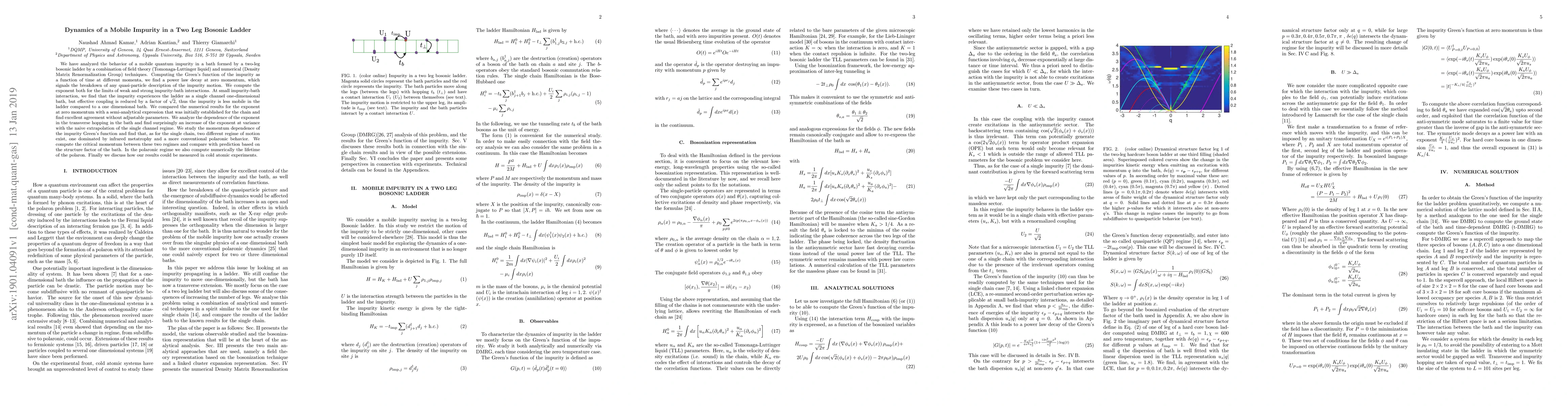 Researchers analyzed a mobile impurity in a two-leg bosonic ladder using field theory and numerical techniques, finding power law decay at zero momentum indicating the breakdown of quasi-particle description, and surprising increases in exponent with transverse hopping.