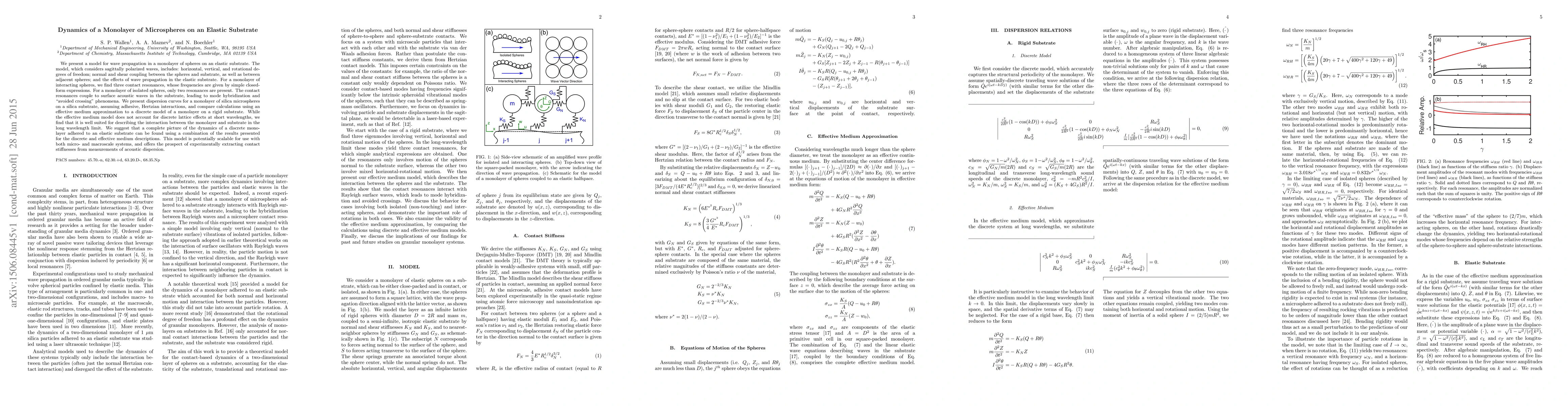 This paper models wave propagation in a monolayer of microspheres on an elastic substrate, identifying three contact resonances in interacting spheres and two in isolated spheres. The study combines discrete and effective medium approaches to describe the dynamics, suggesting a scalable model for both micro- and macroscale systems.