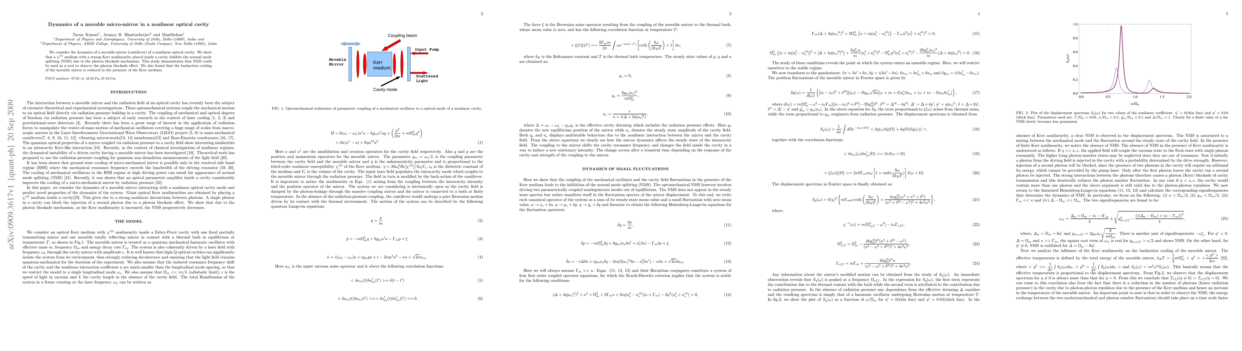 This paper investigates the dynamics of a movable micro-mirror in a nonlinear optical cavity, revealing that a $\chi^{(3)}$ medium with strong Kerr nonlinearity inhibits normal mode splitting via the photon blockade effect. The study also finds that the Kerr medium reduces backaction cooling of the movable mirror.