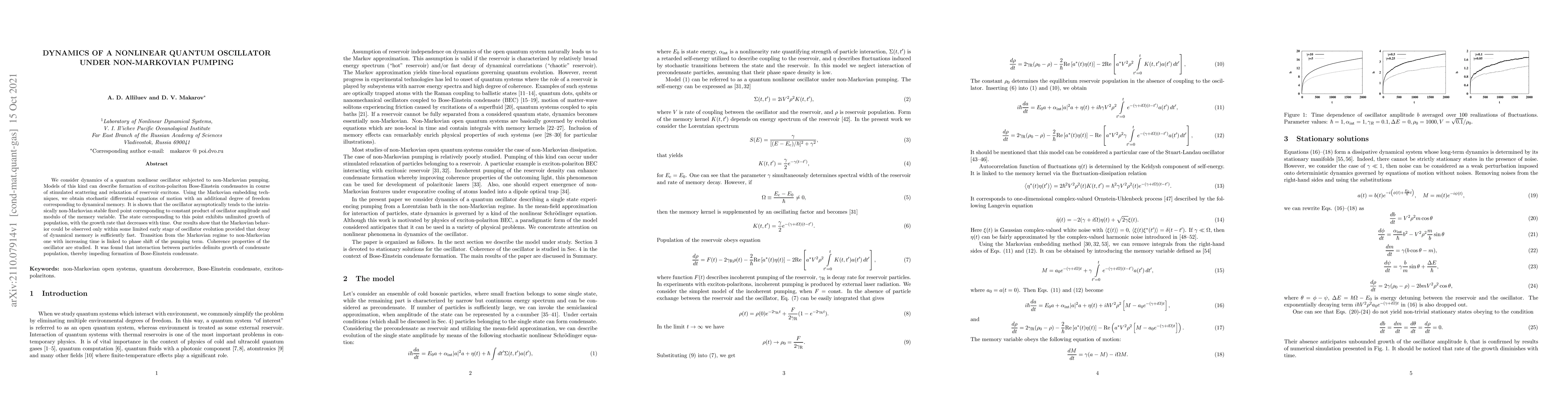 We consider dynamics of a quantum nonlinear oscillator subjected to non-Markovian pumping. Models of this kind can describe formation of exciton-polariton Bose-Einstein condensates in course of stimulated scattering and relaxation of reservoir excitons. Using the Markovian embedding techniques, we obtain stochastic differential equations of motion with an additional degree of freedom corresponding to dynamical memory. It is shown that the oscillator asymptotically tends to the intrinsically non-Markovian stable fixed point corresponding to constant product of oscillator amplitude and modulo of the memory variable. The state corresponding to this point exhibits unlimited growth of population, with the growth rate that decreases with time. Our results show that the Markovian behavior could be observed only within some limited early stage of oscillator evolution provided that decay of dynamical memory is sufficiently fast. Transition from the Markovian regime to non-Markovian one with increasing time is linked to phase shift of the pumping term. Coherence properties of the oscillator are studied. It was found that interaction between particles delimits growth of condensate population, thereby impeding formation of Bose-Einstein condensate.