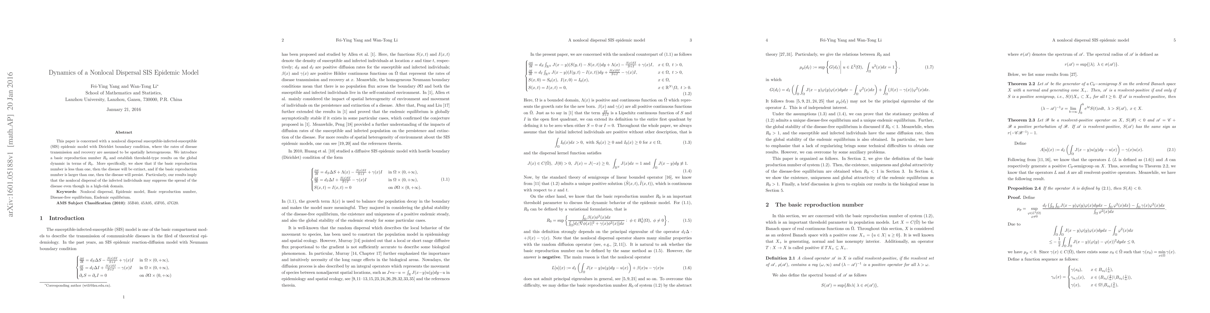 This paper analyzes a nonlocal dispersal SIS epidemic model with spatially heterogeneous transmission and recovery rates, establishing that disease extinction occurs if the basic reproduction number $R_0$ is below one, while persistence occurs if $R_0$ exceeds one. Nonlocal dispersal of infected individuals can suppress disease spread even in high-risk areas.