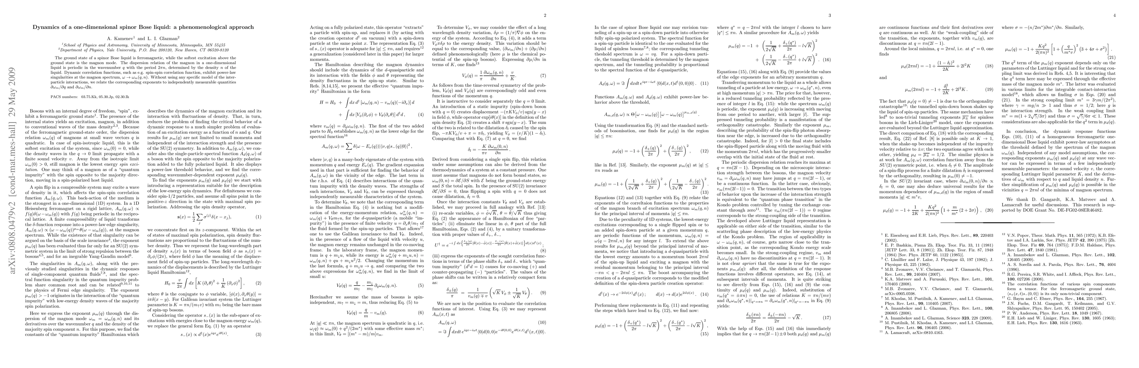 The ground state of a spinor Bose liquid is ferromagnetic, while the softest excitation above the ground state is the magnon mode. The dispersion relation of the magnon in a one-dimensional liquid is periodic in the wavenumber q with the period 2\pi n, determined by the density n of the liquid. Dynamic correlation functions, such as e.g. spin-spin correlation function, exhibit power-law singularities at the magnon spectrum, $\omega\to\omega_m(q,n)$. Without using any specific model of the inter-particle interactions, we relate the corresponding exponents to independently measurable quantities $\partial\omega_m/\partial q$ and $\partial\omega_m/\partial n$.