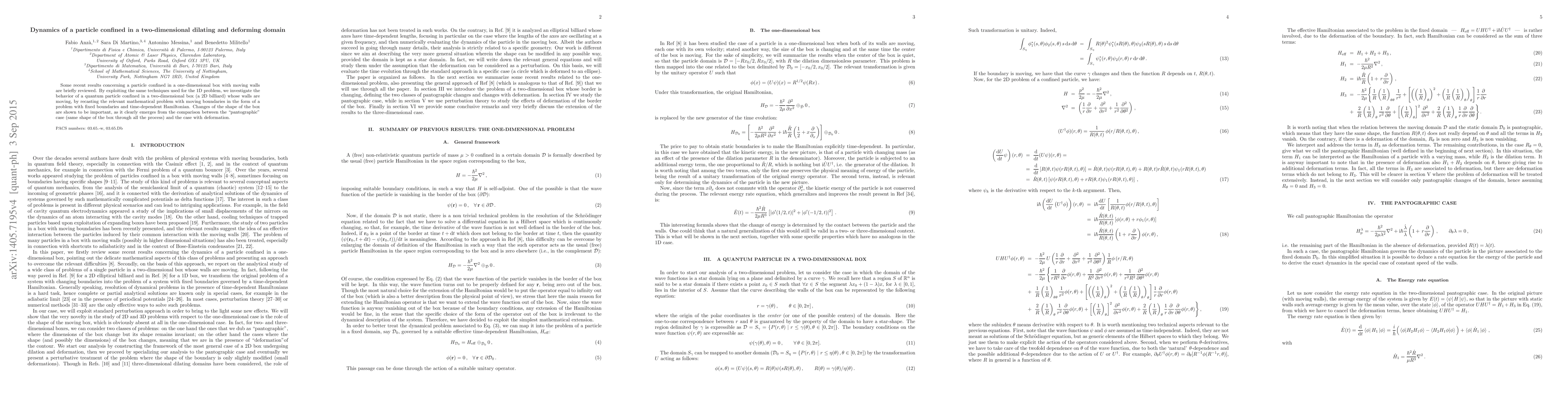 This paper reviews techniques for studying a particle in a one-dimensional box with moving walls and extends these methods to a two-dimensional billiard with deforming walls. It highlights the significance of shape changes in the dynamics of the confined quantum particle.