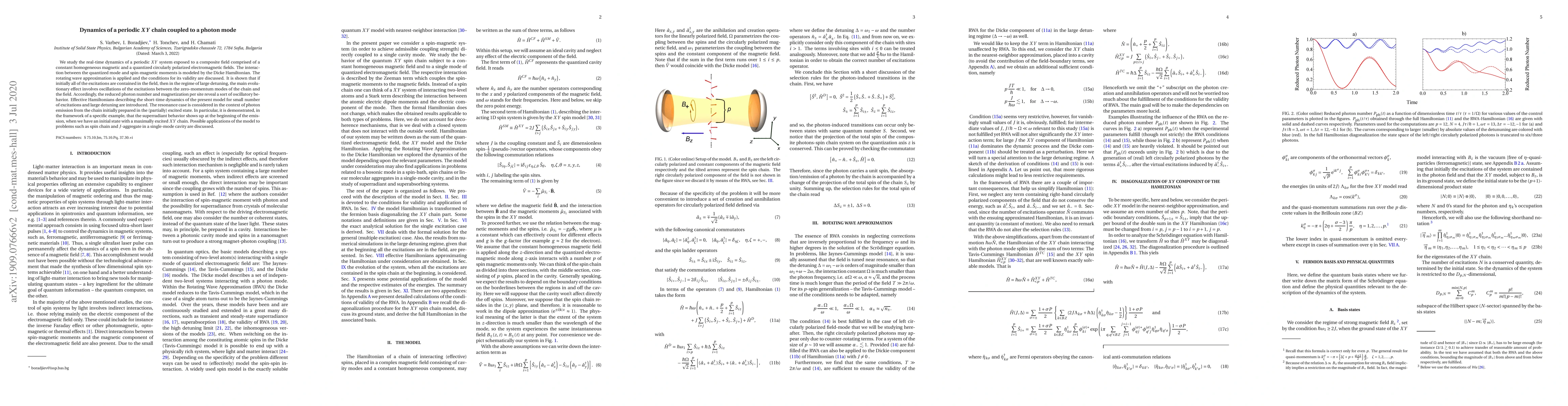 We study the real-time dynamics of a periodic $XY$ system exposed to a composite field comprised of a constant homogeneous magnetic and a quantized circularly polarized electromagnetic fields. The interaction between the quantized mode and spin-magnetic moments is modeled by the Dicke Hamiltonian. The rotating wave approximation is applied and the conditions for its validity are discussed. It is shown that if initially all of the excitations are contained in the field, then in the regime of large detuning, the main evolutionary effect involves oscillations of the excitations between the zero-momentum modes of the chain and the field. Accordingly, the reduced photon number and magnetization per site reveal a sort of oscillatory behavior. Effective Hamiltonians describing the short-time dynamics of the present model for small number of excitations and large detuning are introduced. The resonance case is considered in the context of photon emission from the chain initially prepared in the (partially) excited state. In particular, it is demonstrated, in the framework of a specific example, that the superradiant behavior shows up at the beginning of the emission, when we have an initial state with a maximally excited $XY$ chain. Possible applications of the model to problems such as spin chain and $J$-aggregate in a single-mode cavity are discussed.