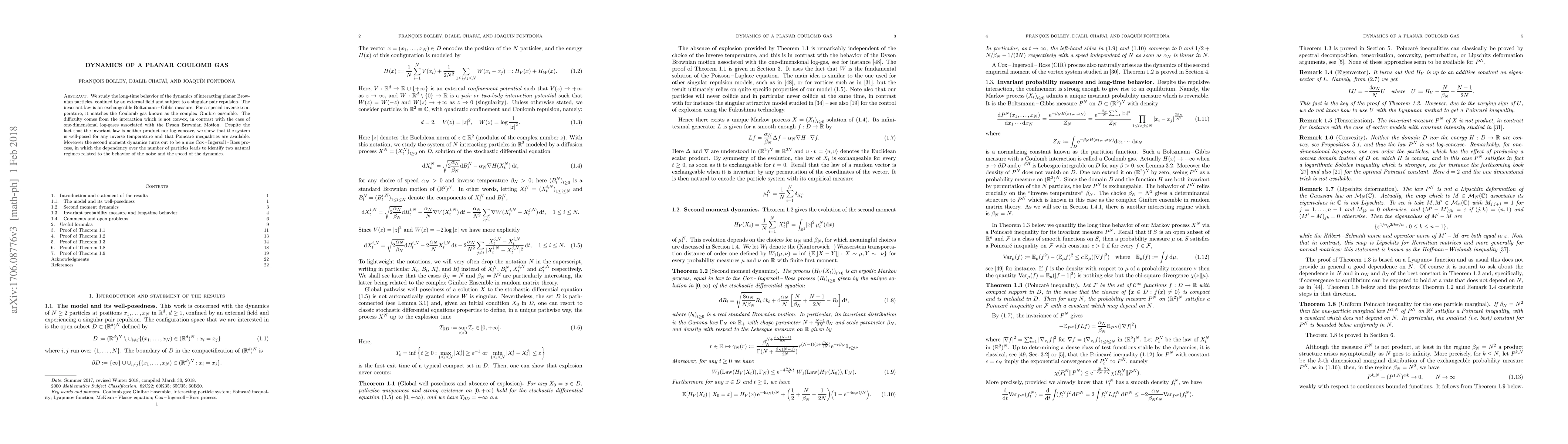We study the long-time behavior of the dynamics of interacting planar Brow-nian particles, confined by an external field and subject to a singular pair repulsion. The invariant law is an exchangeable Boltzmann -- Gibbs measure. For a special inverse temperature, it matches the Coulomb gas known as the complex Ginibre ensemble. The difficulty comes from the interaction which is not convex, in contrast with the case of one-dimensional log-gases associated with the Dyson Brownian Motion. Despite the fact that the invariant law is neither product nor log-concave, we show that the system is well-posed for any inverse temperature and that Poincar{\'e} inequalities are available. Moreover the second moment dynamics turns out to be a nice Cox -- Ingersoll -- Ross process in which the dependency over the number of particles leads to identify two natural regimes related to the behavior of the noise and the speed of the dynamics.