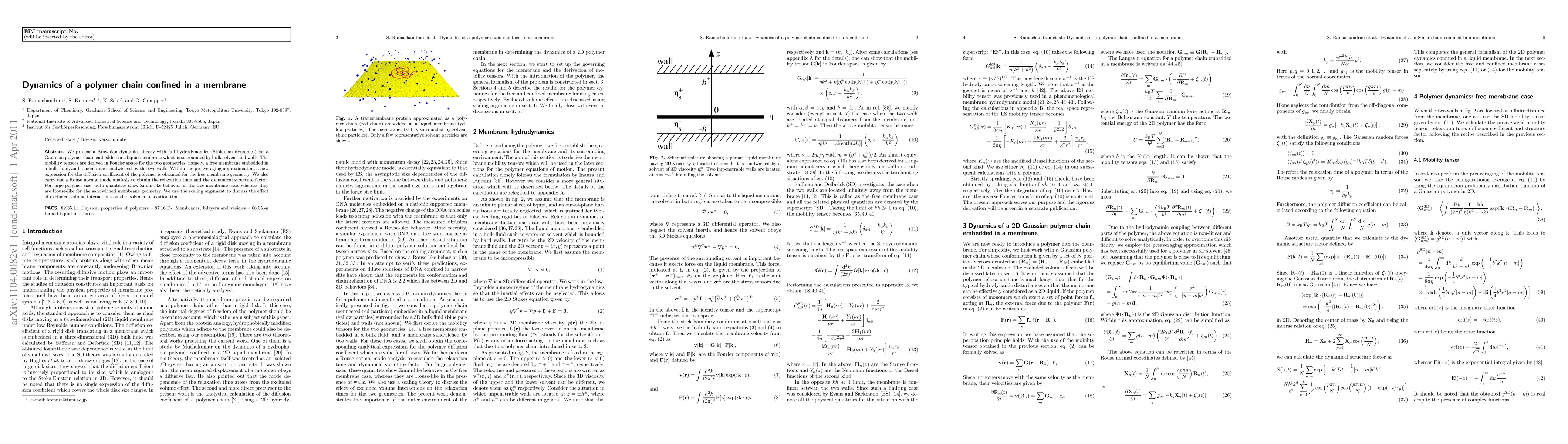 This paper develops a Brownian dynamics theory for a Gaussian polymer chain in a liquid membrane, deriving mobility tensors and a new diffusion coefficient expression. It compares polymer dynamics in free and sandwiched membrane geometries, finding Zimm-like behavior for free membranes and Rouse-like for sandwiched ones, and discusses the effects of excluded volume interactions.