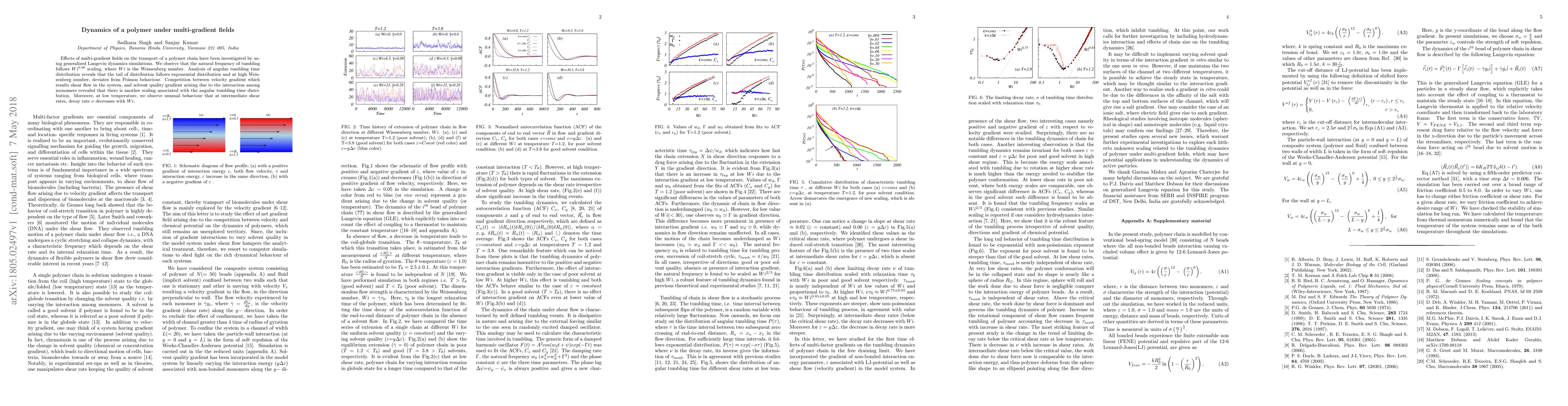 Effects of multi-gradient fields on the transport of a polymer chain have been investigated by using generalized Langevin dynamics simulations. We observe that the natural frequency of tumbling follows $Wi^{0.66}$ scaling, where $Wi$ is the Weissenberg number. Analysis of angular tumbling time distribution reveals that the tail of distribution follows exponential distribution and at high Weissenberg number, deviates from Poisson behaviour. Competition between velocity gradient which results shear flow in the system, and solvent quality gradient arising due to the interaction among monomers revealed that there is another scaling associated with the angular tumbling time distribution. Moreover, at low temperature, we observe unusual behaviour that at intermediate shear rates, decay rate $\nu$ decreases with $Wi$.