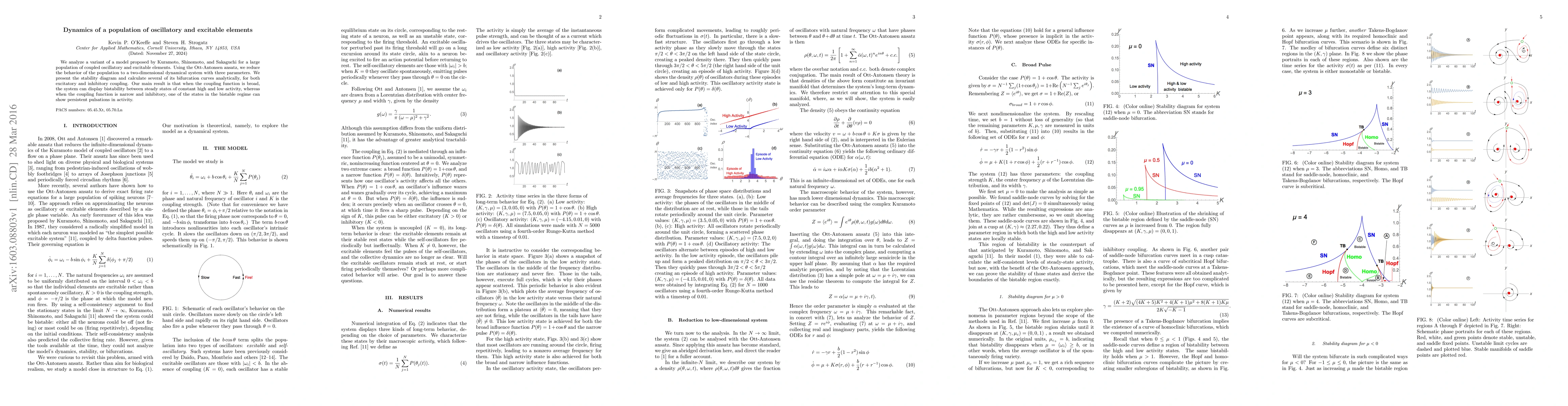 This paper analyzes a Kuramoto-like model for coupled oscillatory and excitable elements, reducing its dynamics to a two-dimensional system using the Ott-Antonsen ansatz. It finds that broad coupling leads to bistability between high and low activity states, while narrow inhibitory coupling can cause persistent pulsations in one state.