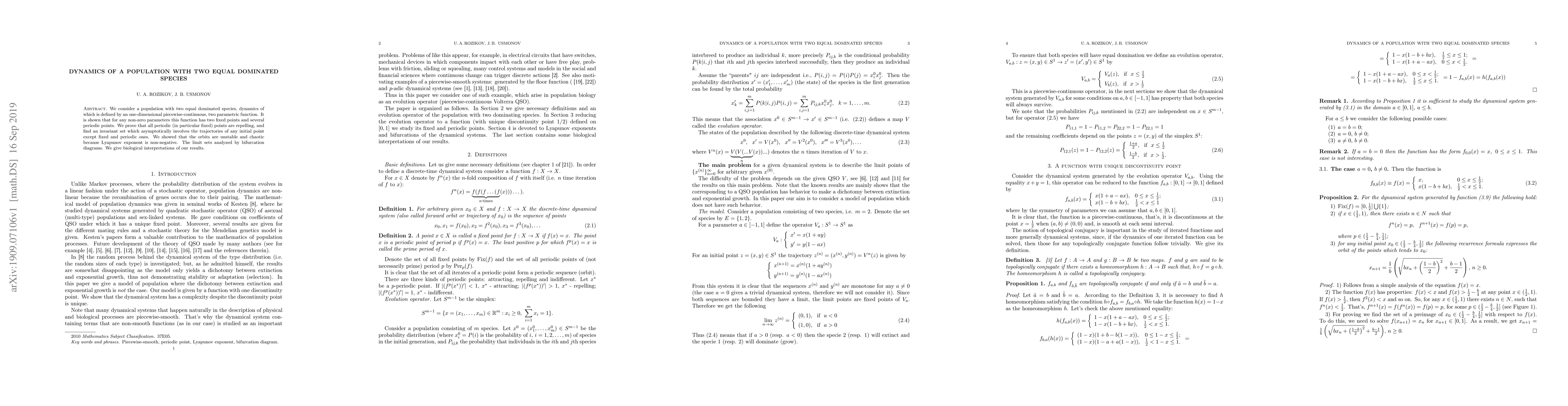 We consider a population with two equal dominated species, dynamics of which is defined by one-dimensional piecewise-continuous, two parametric functions. It is shown that for any non-zero parameters this function has two fixed points and several periodic points. We prove that all periodic (in particular fixed) points are repelling, and find an invariant set which asymptotically involves the trajectories of any initial point except fixed and periodic ones. We showed that the orbits are unstable and chaotic because Lyapunov exponent is non-negative. The limit sets analyzed by bifurcation diagrams. We give biological interpretations of our results.