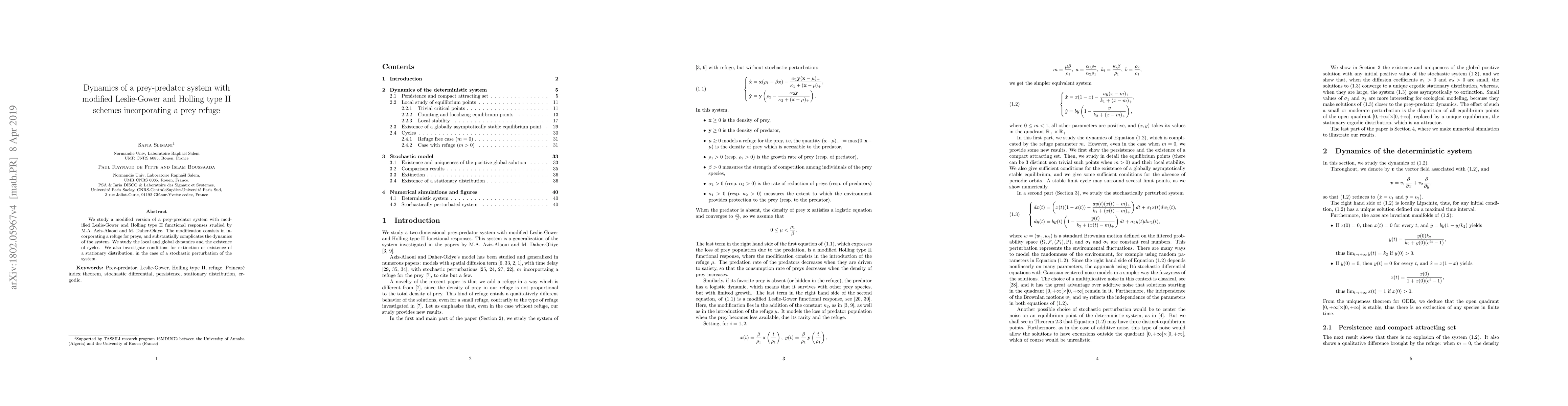 This paper examines a modified prey-predator model with Leslie-Gower and Holling type II schemes, incorporating a prey refuge, to analyze its local and global dynamics, cycle existence, and the impact of stochastic perturbations on extinction or stationary distribution.