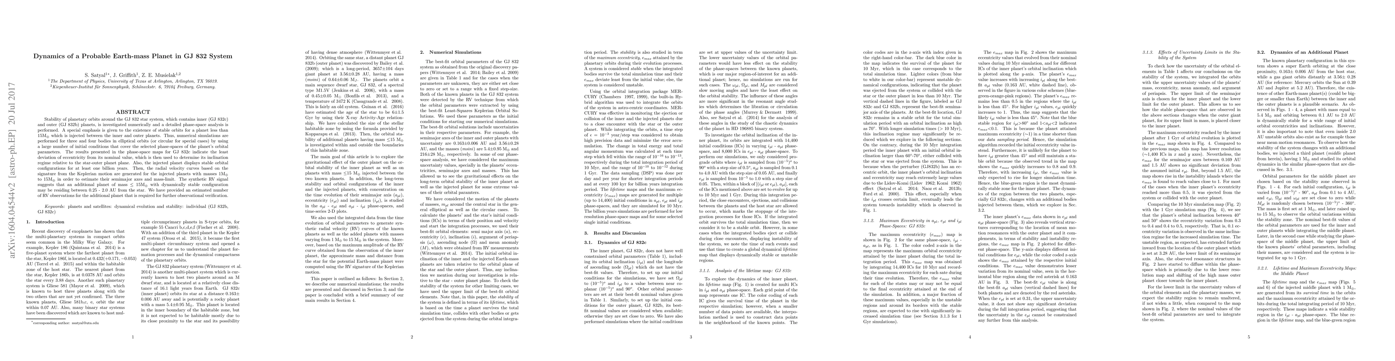 This research investigates the stability of planetary orbits in the GJ 832 system, focusing on the potential for a stable Earth-mass planet between the inner and outer planets. Numerical simulations reveal that a planet with a mass up to 15 Earth masses can maintain stable orbits for over a billion years, suggesting the presence of an additional planet in the system.