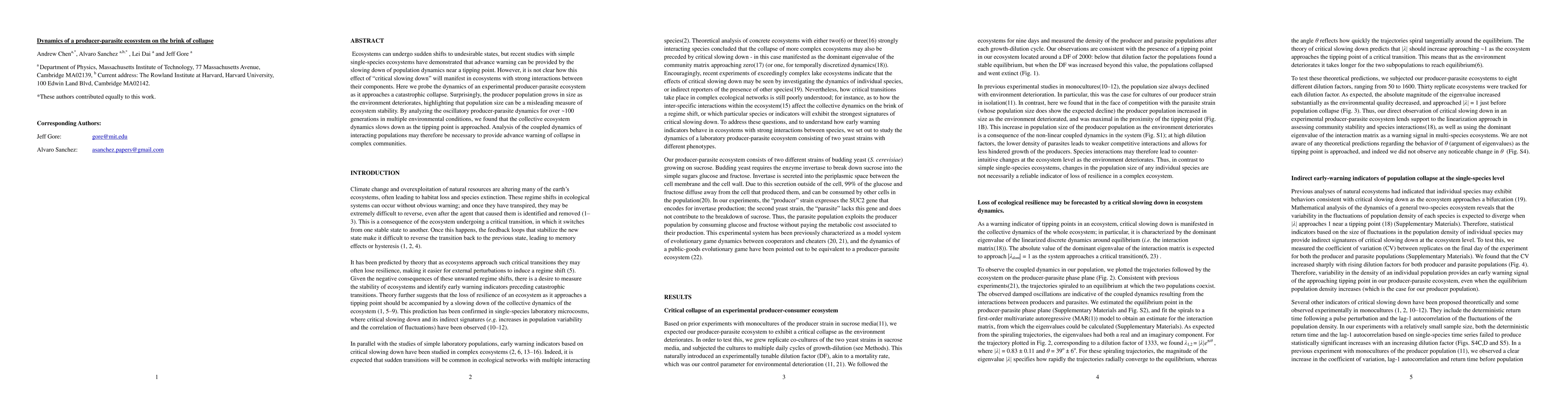 This study investigates the dynamics of a producer-parasite ecosystem nearing collapse, finding that critical slowing down—a slowing of population dynamics—precedes a tipping point. Contrary to expectations, the producer population increases as the ecosystem deteriorates, indicating that population size alone is not a reliable stability indicator.