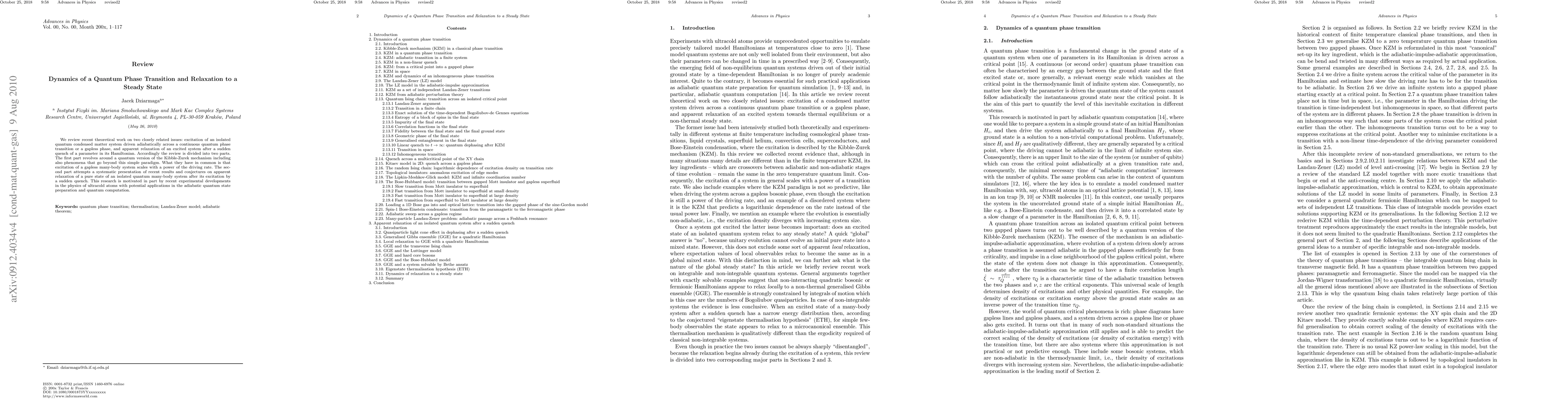 We review recent theoretical work on two closely related issues: excitation of an isolated quantum condensed matter system driven adiabatically across a continuous quantum phase transition or a gapless phase, and apparent relaxation of an excited system after a sudden quench of a parameter in its Hamiltonian. Accordingly the review is divided into two parts. The first part revolves around a quantum version of the Kibble-Zurek mechanism including also phenomena that go beyond this simple paradigm. What they have in common is that excitation of a gapless many-body system scales with a power of the driving rate. The second part attempts a systematic presentation of recent results and conjectures on apparent relaxation of a pure state of an isolated quantum many-body system after its excitation by a sudden quench. This research is motivated in part by recent experimental developments in the physics of ultracold atoms with potential applications in the adiabatic quantum state preparation and quantum computation.