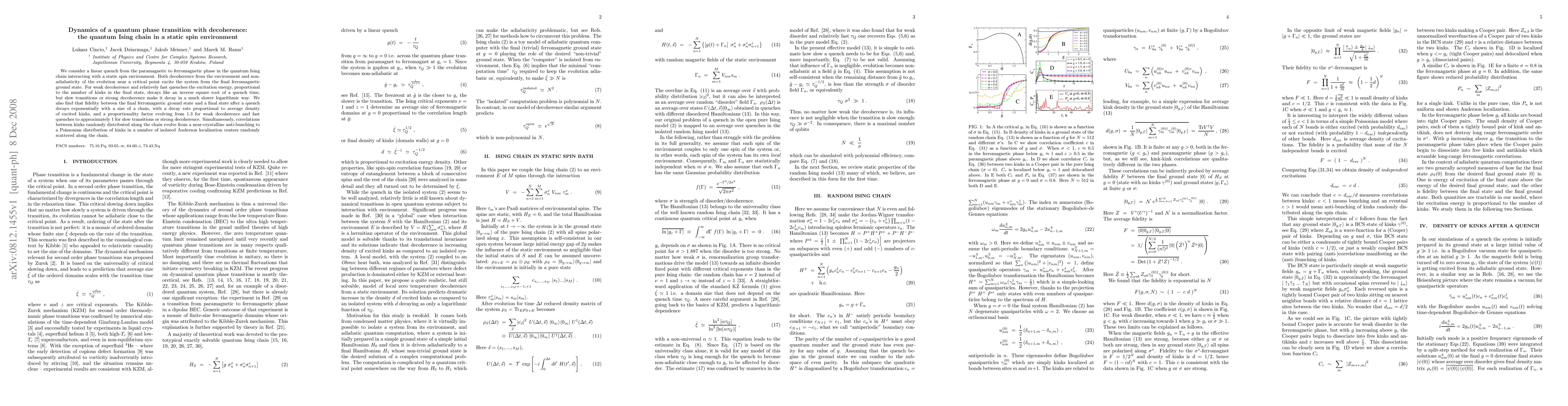 We consider a linear quench from the paramagnetic to ferromagnetic phase in the quantum Ising chain interacting with a static spin environment. Both decoherence from the environment and non-adiabaticity of the evolution near a critical point excite the system from the final ferromagnetic ground state. For weak decoherence and relatively fast quenches the excitation energy, proportional to the number of kinks in the final state, decays like an inverse square root of a quench time, but slow transitions or strong decoherence make it decay in a much slower logarithmic way. We also find that fidelity between the final ferromagnetic ground state and a final state after a quench decays exponentially with a size of a chain, with a decay rate proportional to average density of excited kinks, and a proportionality factor evolving from 1.3 for weak decoherence and fast quenches to approximately 1 for slow transitions or strong decoherence. Simultaneously, correlations between kinks randomly distributed along the chain evolve from a near-crystalline anti-bunching to a Poissonian distribution of kinks in a number of isolated Anderson localization centers randomly scattered along the chain.