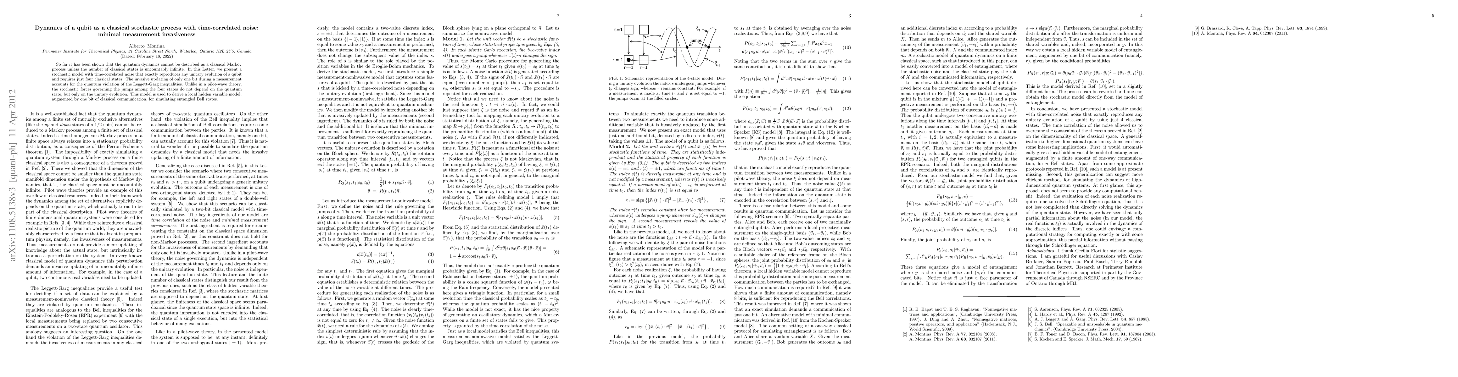 So far it has been shown that the quantum dynamics cannot be described as a classical Markov process unless the number of classical states is uncountably infinite. In this paper, we present a stochastic model with time-correlated noise that exactly reproduces any unitary evolution of a qubit and requires just four classical states. The invasive updating of just one bit during a measurement accounts for the quantum violation of the Leggett-Garg inequalities. Unlike in a pilot wave theory, the stochastic forces governing the jumps among the four states do not depend on the quantum state, but only on the unitary evolution. This model is used to derive a local hidden variable model, augmented by one bit of classical communication, for simulating entangled Bell states.