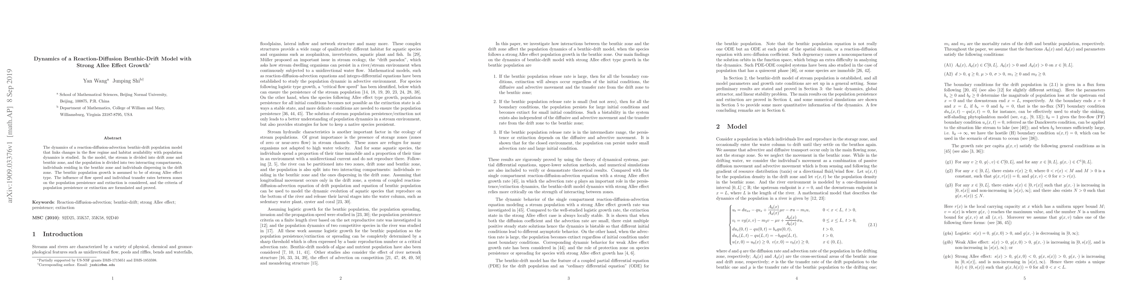 The dynamics of a reaction-diffusion-advection benthic-drift population model that links changes in the flow regime and habitat availability with population dynamics is studied. In the model, the stream is divided into drift zone and benthic zone, and the population is divided into two interacting compartments, individuals residing in the benthic zone and individuals dispersing in the drift zone. The benthic population growth is assumed to be of strong Allee effect type. The influence of flow speed and individual transfer rates between zones on the population persistence and extinction is considered, and the criteria of population persistence or extinction are formulated and proved.