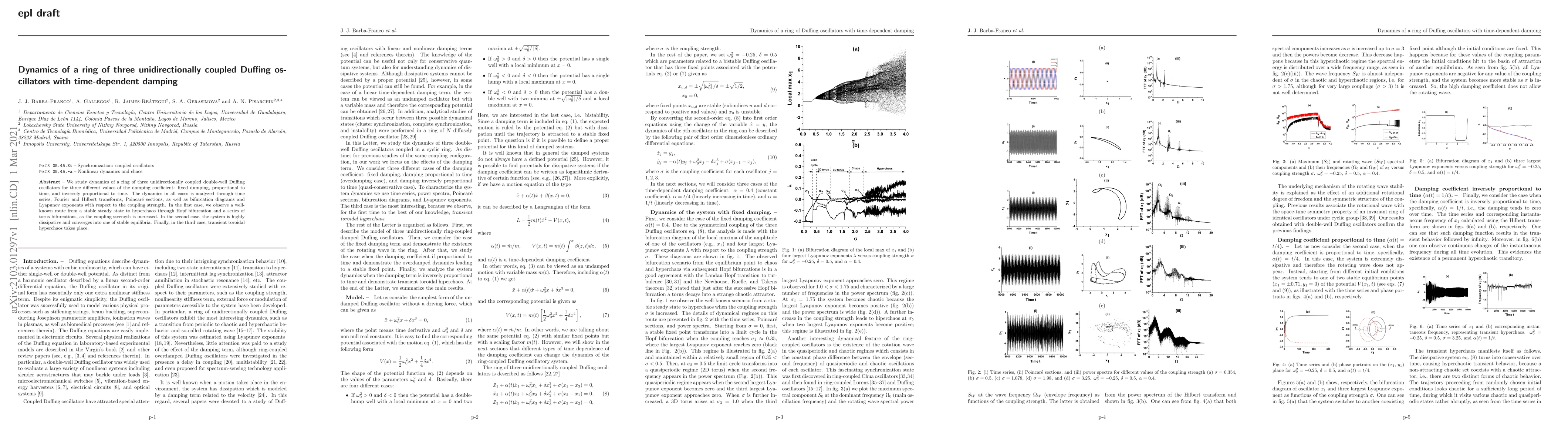 We study dynamics of a ring of three unidirectionally coupled double-well Duffing oscillators for three different values of the damping coefficient: fixed dumping, proportional to time, and inversely proportional to time. The dynamics in all cases is analyzed through time series, Fourier and Hilbert transforms, Poincar\'e sections, as well as bifurcation diagrams and Lyapunov exponents with respect to the coupling strength. In the first case, we observe a well-known route from a stable steady state to hyperchaos through Hopf bifurcation and a series of torus bifurcations, as the coupling strength is increased. In the second case, the system is highly dissipative and converges into one of stable equilibria. Finally, in the third case, transient toroidal hyperchaos takes place.