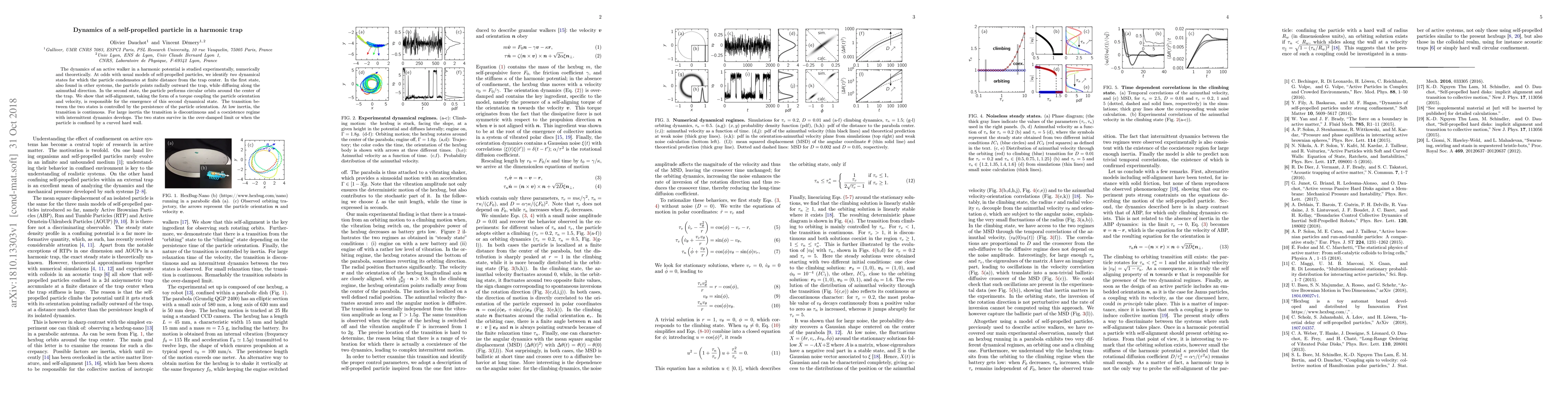 The dynamics of an active walker in a harmonic potential is studied experimentally, numerically and theoretically. At odds with usual models of self-propelled particles, we identify two dynamical states for which the particle condensates at finite distance from the trap center. In the first state, also found in other systems, the particle points radially outward the trap, while diffusing along the azimuthal direction. In the second state, the particle performs circular orbits around the center of the trap. We show that self-alignment, taking the form of a torque coupling the particle orientation and velocity, is responsible for the emergence of this second dynamical state. The transition between the two states is controlled by the persistence of the particle orientation. At low inertia, the transition is continuous. For large inertia the transition is discontinuous and a coexistence regime with intermittent dynamics develops. The two states survive in the over-damped limit or when the particle is confined by a curved hard wall.