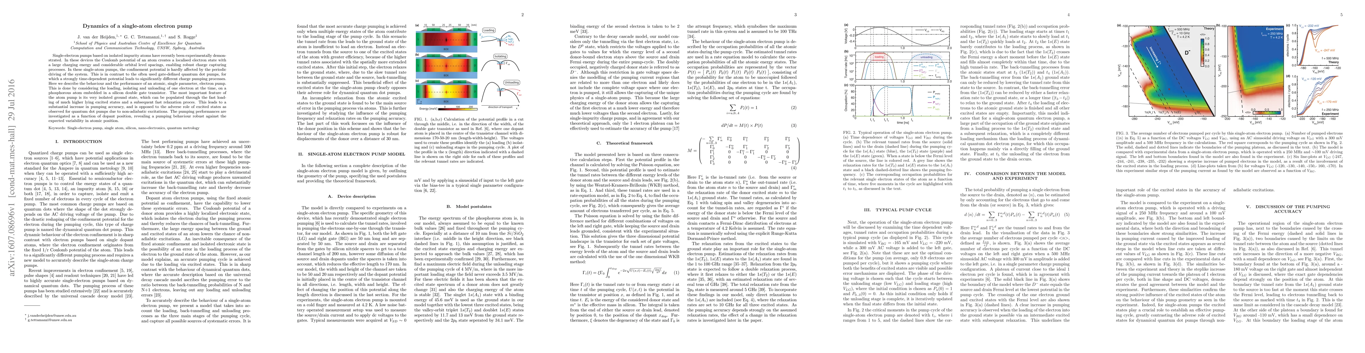 Single-electron pumps based on isolated impurity atoms have recently been experimentally demonstrated. In these devices the Coulomb potential of an atom creates a localised electron state with a large charging energy and considerable orbital level spacings, enabling robust charge capturing processes. In these single-atom pumps, the confinement potential is hardly affected by the periodic driving of the system. This is in contrast to the often used gate-defined quantum dot pumps, for which a strongly time-dependent potential leads to significantly different charge pumping processes. Here we describe the behaviour and the performance of an atomic, single parameter, electron pump. This is done by considering the loading, isolating and unloading of one electron at the time, on a phosphorous atom embedded in a silicon double gate transistor. The most important feature of the atom pump is its very isolated ground state, which can be populated through the fast loading of much higher lying excited states and a subsequent fast relaxation proces. This leads to a substantial increase in pumping accuracy, and is opposed to the adverse role of excited states as observed for quantum dot pumps due to non-adiabatic excitations. The pumping performances are investigated as a function of dopant position, revealing a pumping behaviour robust against the expected variability in atomic position.