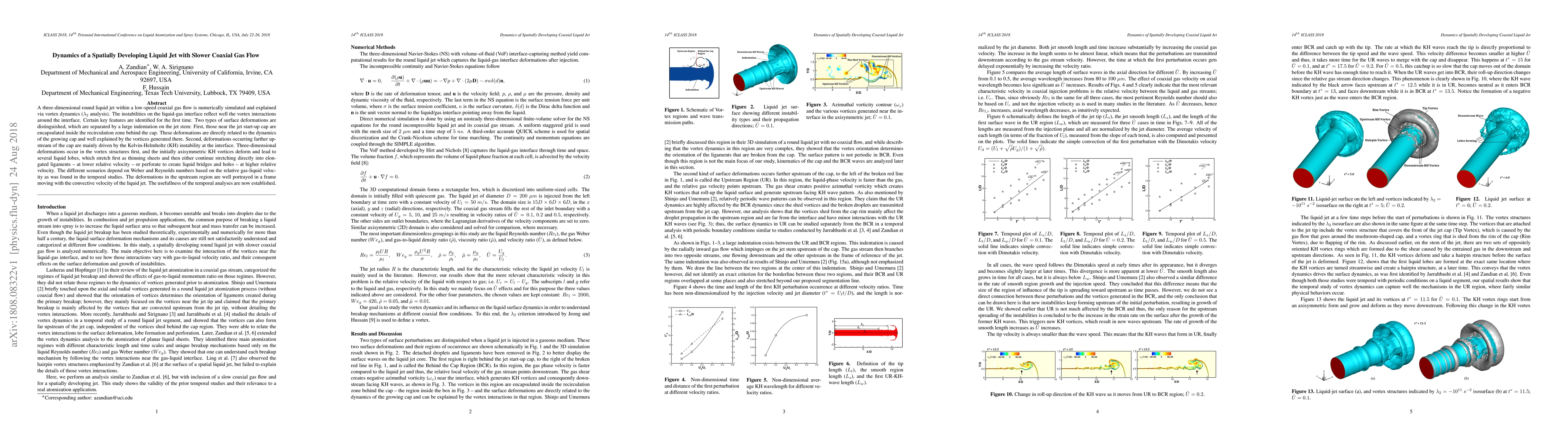 A three-dimensional round liquid jet within a low-speed coaxial gas flow is numerically simulated and explained via vortex dynamics ($\lambda_2$ method). The instabilities on the liquid-gas interface reflect well the vortex interactions around the interface. Certain key features are identified for the first time. Two types of surface deformations are distinguished, which are separated by a large indentation on the jet stem: First, those near the jet start-up cap are encapsulated inside the recirculation zone behind the cap. These deformations are directly related to the dynamics of the growing cap and well explained by the vortices generated there. Second, deformations occurring farther upstream of the cap are mainly driven by the Kelvin-Helmholtz (KH) instability at the interface. Three-dimensional deformations occur in the vortex structures first, and the initially axisymmetric KH vortices deform and lead to several liquid lobes, which stretch first as thinning sheets and then either continue stretching directly into elongated ligaments - at lower relative velocity - or perforate to create liquid bridges and holes - at higher relative velocity. The different scenarios depend on Weber and Reynolds numbers based on the relative gas-liquid velocity as was found in the temporal studies. The deformations in the upstream region are well portrayed in a frame moving with the convective velocity of the liquid jet. The usefulness of the temporal analyses are now established.