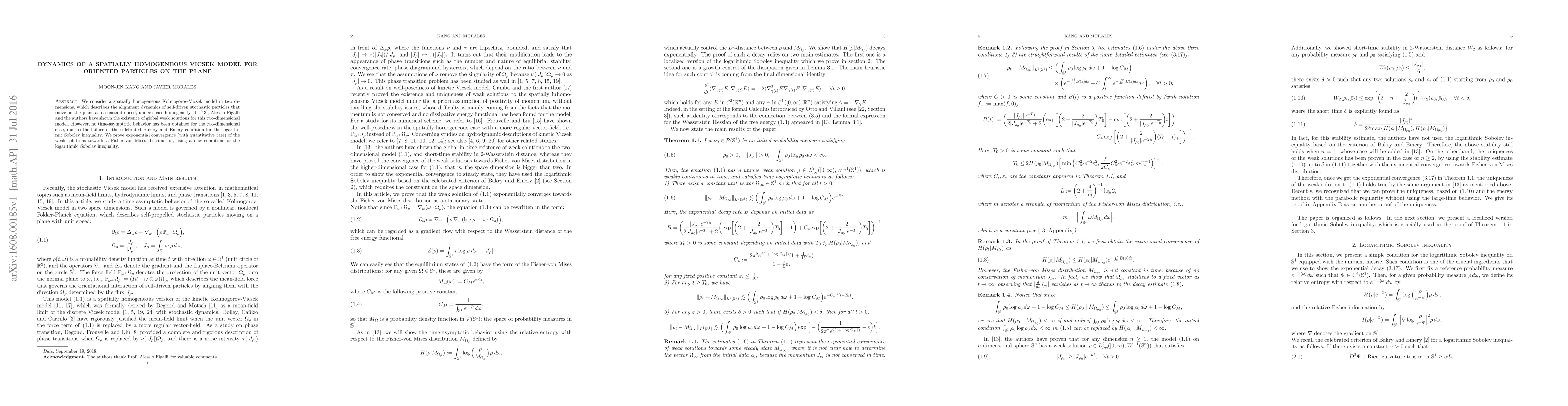 We consider a spatially homogeneous Kolmogorov-Vicsek model in two dimensions, which describes the alignment dynamics of self-driven stochastic particles that move on the plane at a constant speed, under space-homogeneity. In \cite{F-K-M}, Alessio Figalli and the authors have shown the existence of global weak solutions for this two-dimensional model. However, no time-asymptotic behavior has been obtained for the two-dimensional case, due to the failure of the celebrated Bakery and Emery condition for the logarithmic Sobolev inequality. We prove exponential convergence (with quantitative rate) of the weak solutions towards a Fisher-von Mises distribution, using a new condition for the logarithmic Sobolev inequality.