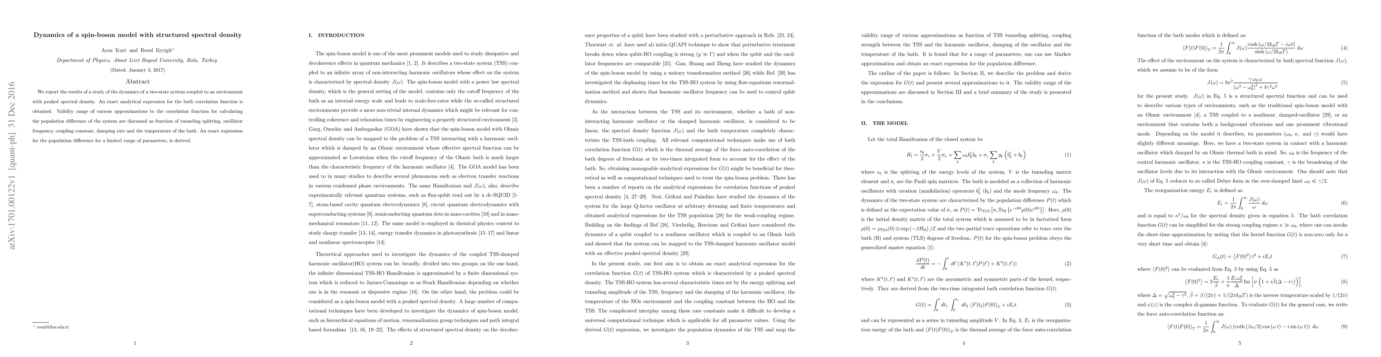 We report the results of a study of the dynamics of a two-state system coupled to an environment with peaked spectral density. An exact analytical expression for the bath correlation function is obtained. Validity range of various approximations to the correlation function for calculating the population difference of the system are discussed as function of tunneling splitting, oscillator frequency, coupling constant, damping rate and the temperature of the bath. An exact expression for the population difference for a limited range of parameters, is derived.