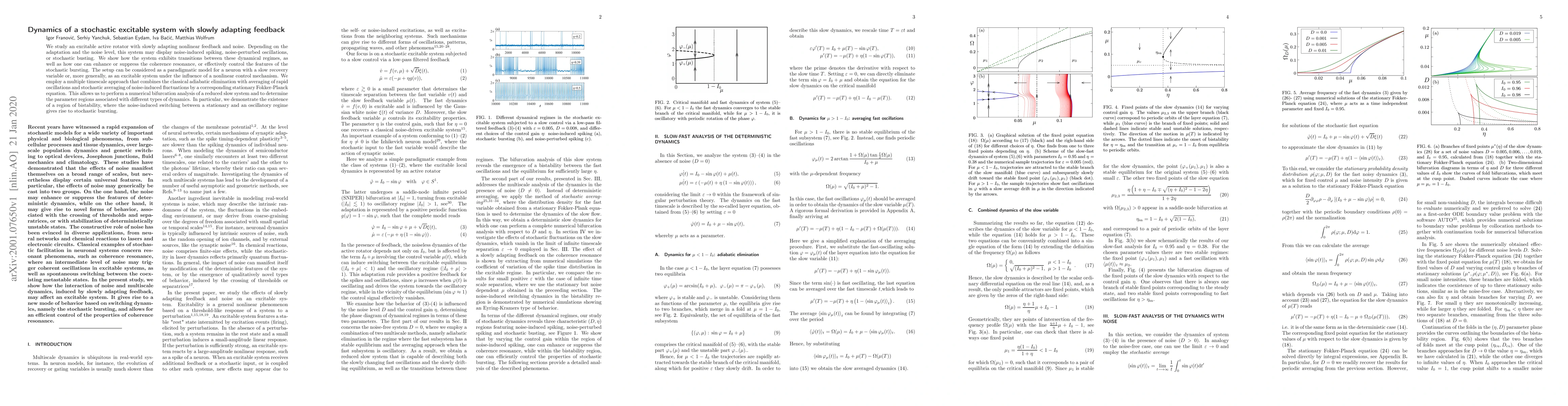 We study an excitable active rotator with slowly adapting nonlinear feedback and noise. Depending on the adaptation and the noise level, this system may display noise-induced spiking, noise-perturbed oscillations, or stochastic busting. We show how the system exhibits transitions between these dynamical regimes, as well as how one can enhance or suppress the coherence resonance, or effectively control the features of the stochastic bursting. The setup can be considered as a paradigmatic model for a neuron with a slow recovery variable or, more generally, as an excitable system under the influence of a nonlinear control mechanism. We employ a multiple timescale approach that combines the classical adiabatic elimination with averaging of rapid oscillations and stochastic averaging of noise-induced fluctuations by a corresponding stationary Fokker-Planck equation. This allows us to perform a numerical bifurcation analysis of a reduced slow system and to determine the parameter regions associated with different types of dynamics. In particular, we demonstrate the existence of a region of bistability, where the noise-induced switching between a stationary and an oscillatory regime gives rise to stochastic bursting.