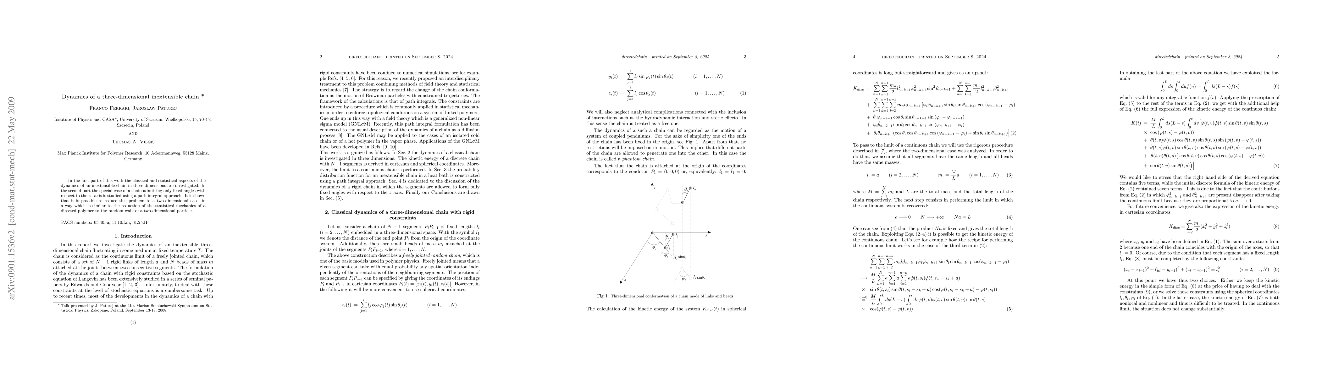 In the first part of this work the classical and statistical aspects of the dynamics of an inextensible chain in three dimensions are investigated. In the second part the special case of a chain admitting only fixed angles with respect to the $z-$axis is studied using a path integral approach. It is shown that it is possible to reduce this problem to a two-dimensional case, in a way which is similar to the reduction of the statistical mechanics of a directed polymer to the random walk of a two-dimensional particle.