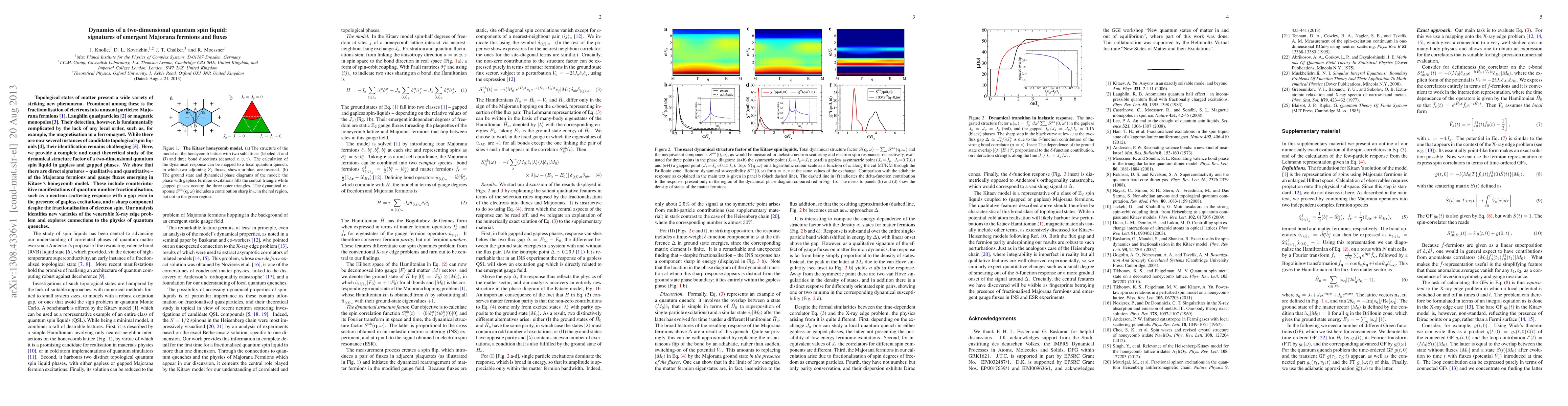 This paper explores the dynamics of a two-dimensional quantum spin liquid, revealing signatures of emergent Majorana fermions and fluxes through theoretical analysis of its dynamical structure factor. The study uncovers unique scattering responses indicative of quantum fractionalisation, even in gapless phases, providing new insights into topological spin liquids.