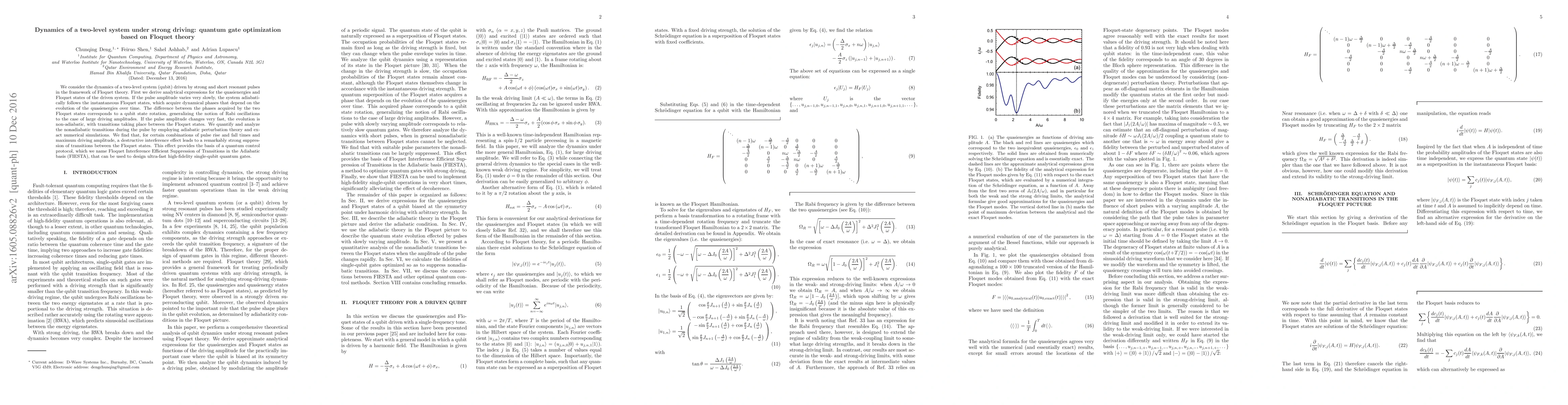 We consider the dynamics of a two-level system (qubit) driven by strong and short resonant pulses in the framework of Floquet theory. First we derive analytical expressions for the quasienergies and Floquet states of the driven system. If the pulse amplitude varies very slowly, the system adiabatically follows the instantaneous Floquet states, which acquire dynamical phases that depend on the evolution of the quasienergies over time. The difference between the phases acquired by the two Floquet states corresponds to a qubit state rotation, generalizing the notion of Rabi oscillations to the case of large driving amplitudes. If the pulse amplitude changes very fast, the evolution is non-adiabatic, with transitions taking place between the Floquet states. We quantify and analyze the nonadiabatic transitions during the pulse by employing adiabatic perturbation theory and exact numerical simulations. We find that, for certain combinations of pulse rise and fall times and maximum driving amplitude, a destructive interference effect leads to a remarkably strong suppression of transitions between the Floquet states. This effect provides the basis of a quantum control protocol, which we name Floquet Interference Efficient Suppression of Transitions in the Adiabatic basis (FIESTA), that can be used to design ultra-fast high-fidelity single-qubit quantum gates.