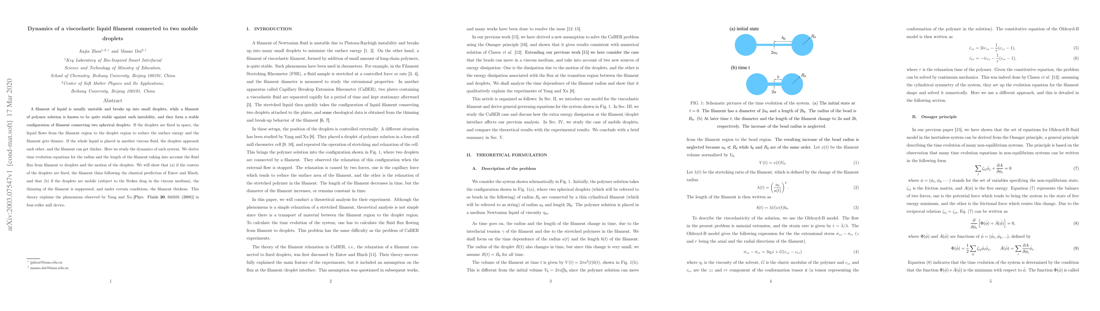 This research derives equations for the dynamics of a viscoelastic liquid filament linking two mobile droplets, showing that a fixed filament thins as classically predicted, but with mobile droplets, filament thickening occurs under certain conditions, explained by observations in a four-roller mill device.