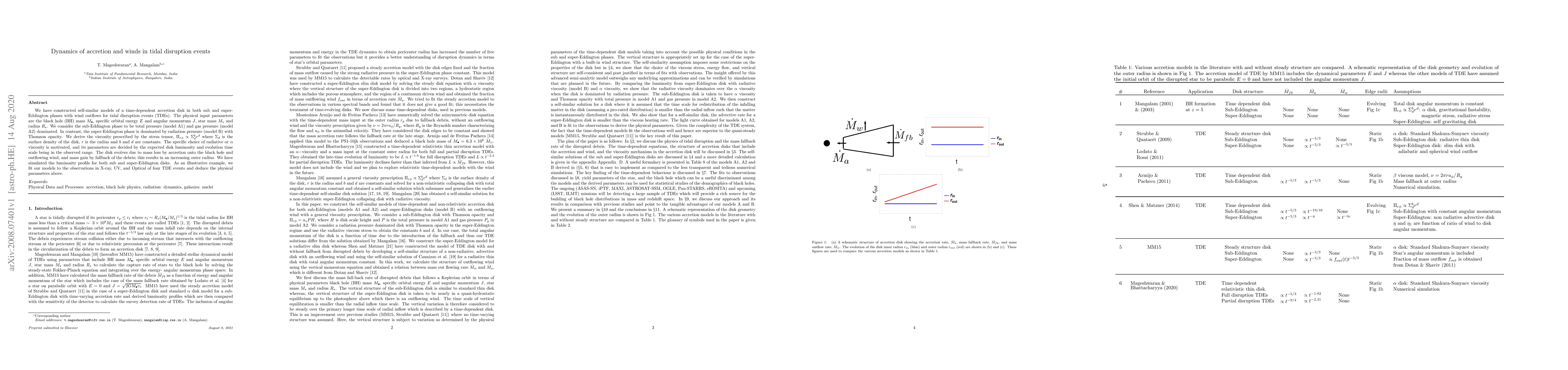 We have constructed self-similar models of a time-dependent accretion disk in both sub and super-Eddington phases with wind outflows for tidal disruption events (TDEs). The physical input parameters are the black hole (BH) mass $M_{\bullet}$, specific orbital energy $E$ and angular momentum $J$, star mass $M_{\star}$ and radius $R_{\star}$. We consider the sub-Eddington phase to be total pressure (model A1) and gas pressure (model A2) dominated. In contrast, the super-Eddington phase is dominated by radiation pressure (model B) with Thomson opacity. We derive the viscosity prescribed by the stress tensor, $\Pi_{r\phi}\propto \Sigma_d^b r^d$ where $\Sigma_d$ is the surface density of the disk, $r$ is the radius and $b$ and $d$ are constants. The specific choice of radiative or $\alpha$ viscosity is motivated, and its parameters are decided by the expected disk luminosity and evolution time scale being in the observed range. The disk evolves due to mass loss by accretion onto the black hole and outflowing wind, and mass gain by fallback of the debris; this results in an increasing outer radius. We have simulated the luminosity profile for both sub and super-Eddington disks. As an illustrative example, we fit our models to the observations in X-ray, UV, and Optical of four TDE events and deduce the physical parameters above.