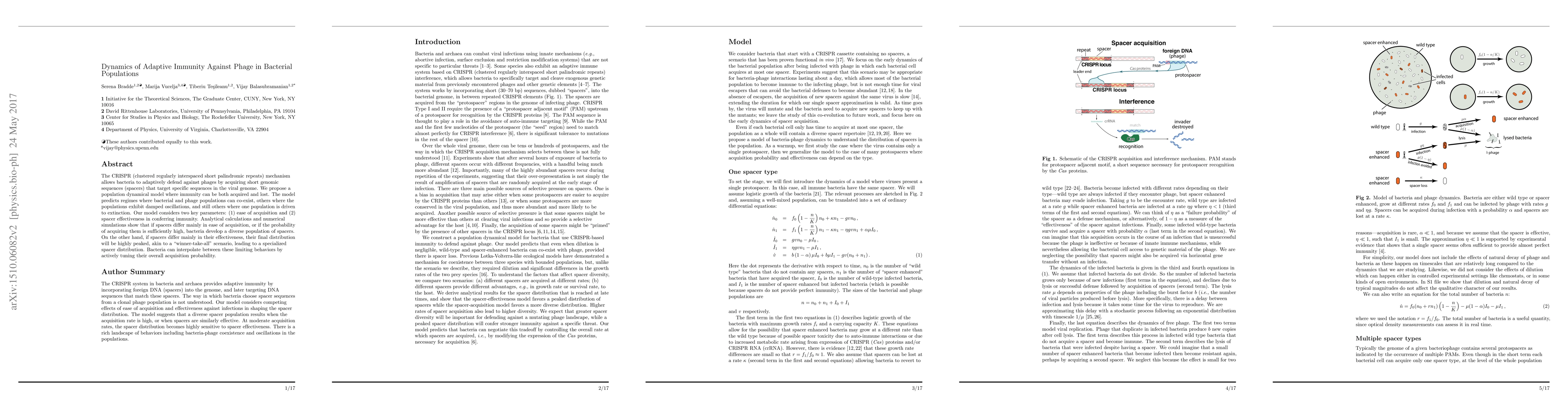 This paper develops a population dynamical model to explore the adaptive immunity of bacteria against phages via the CRISPR mechanism. It finds that bacterial populations can either develop diverse or specialized spacer distributions depending on the ease of spacer acquisition and their effectiveness, influencing the dynamics of bacterial and phage coexistence.